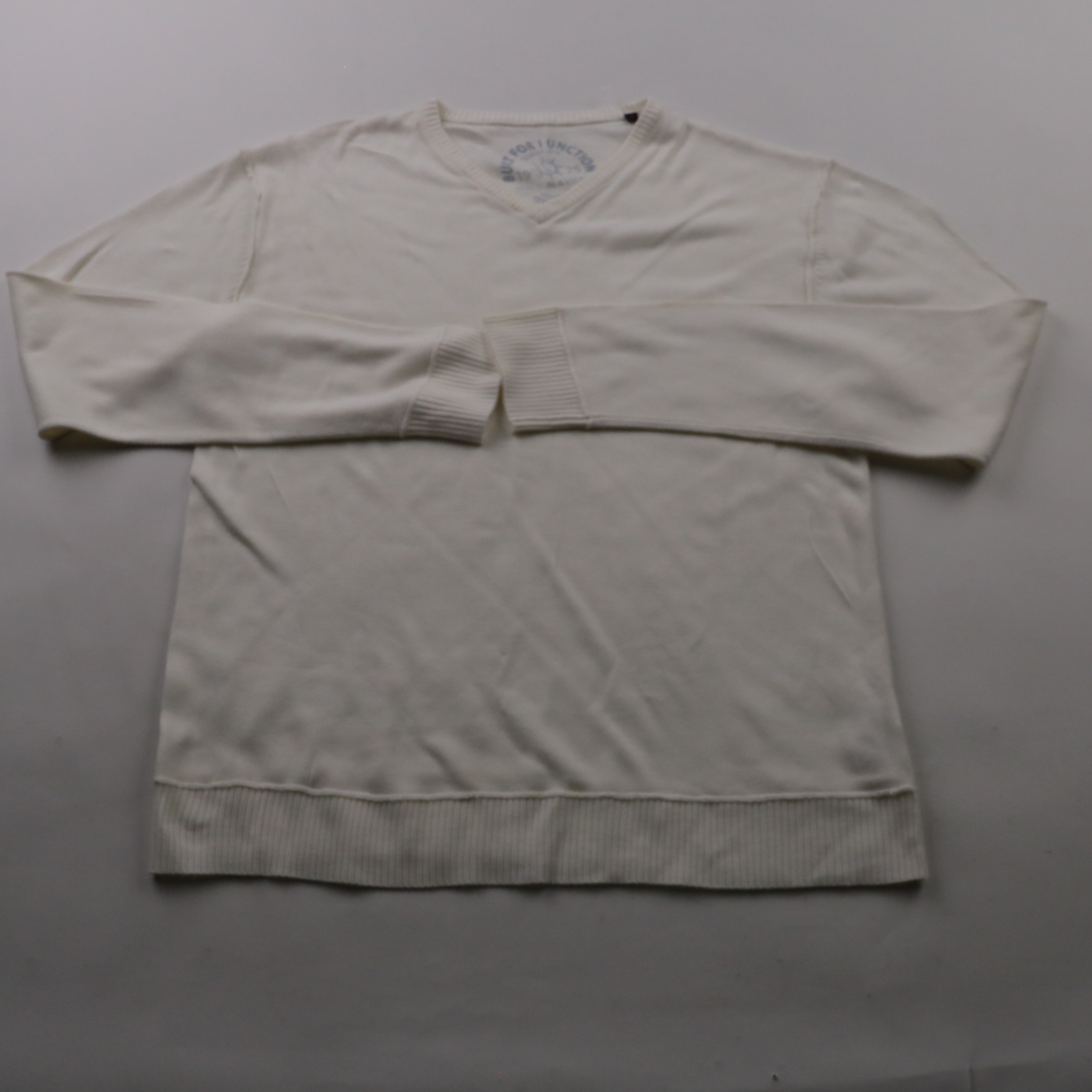 Джемпер Serviceable молочного цвета с V-образным вырезом и трикотажными манжетами. Подойдёт для повседневных образов и офиса, удобно носить как самостоятельный слой или под куртку. Практичный акриловый материал прост в уходе и быстро сохнет.