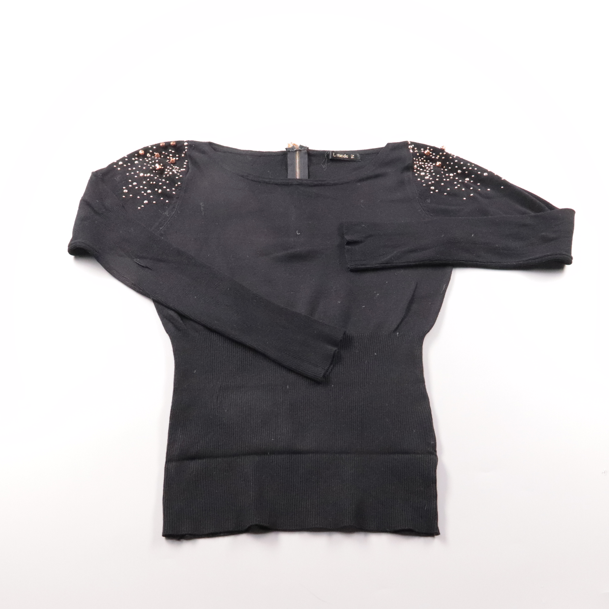 Черная кофта Lmode из мягкого трикотажа с декоративными стразами на плечах. Подойдет для повседневных образов и выхода вечером, хорошо смотрится с джинсами и юбкой. Эластичная ткань комфортно садится по фигуре и не сковывает движения.