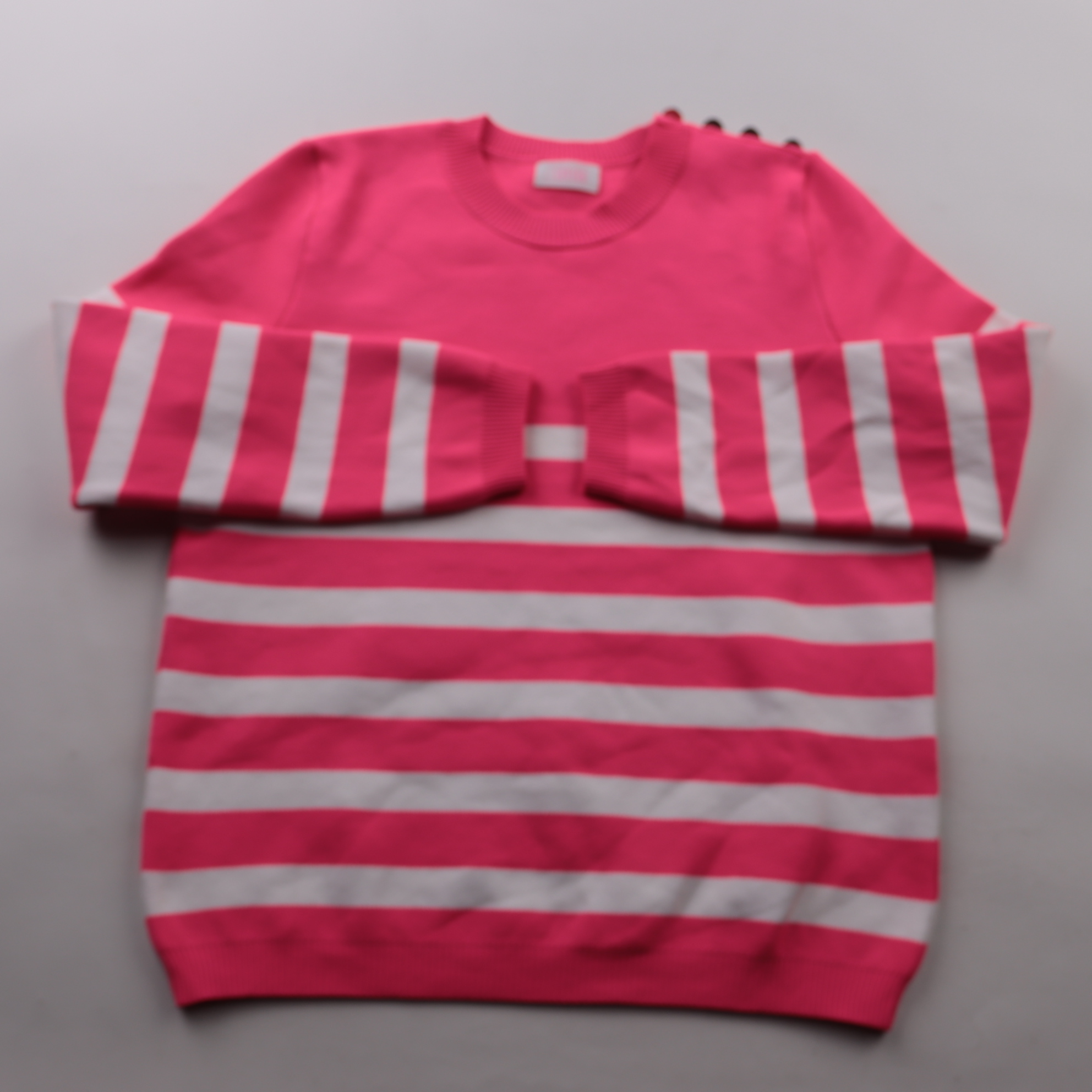 Яркий джемпер Savida в розово-белую полоску с круглым вырезом и декоративными пуговицами на плече. Подойдёт для повседневных образов в межсезонье, хорошо сочетается с джинсами и однотонными брюками. Практичный материал из полиэстера почти не мнётся и п...