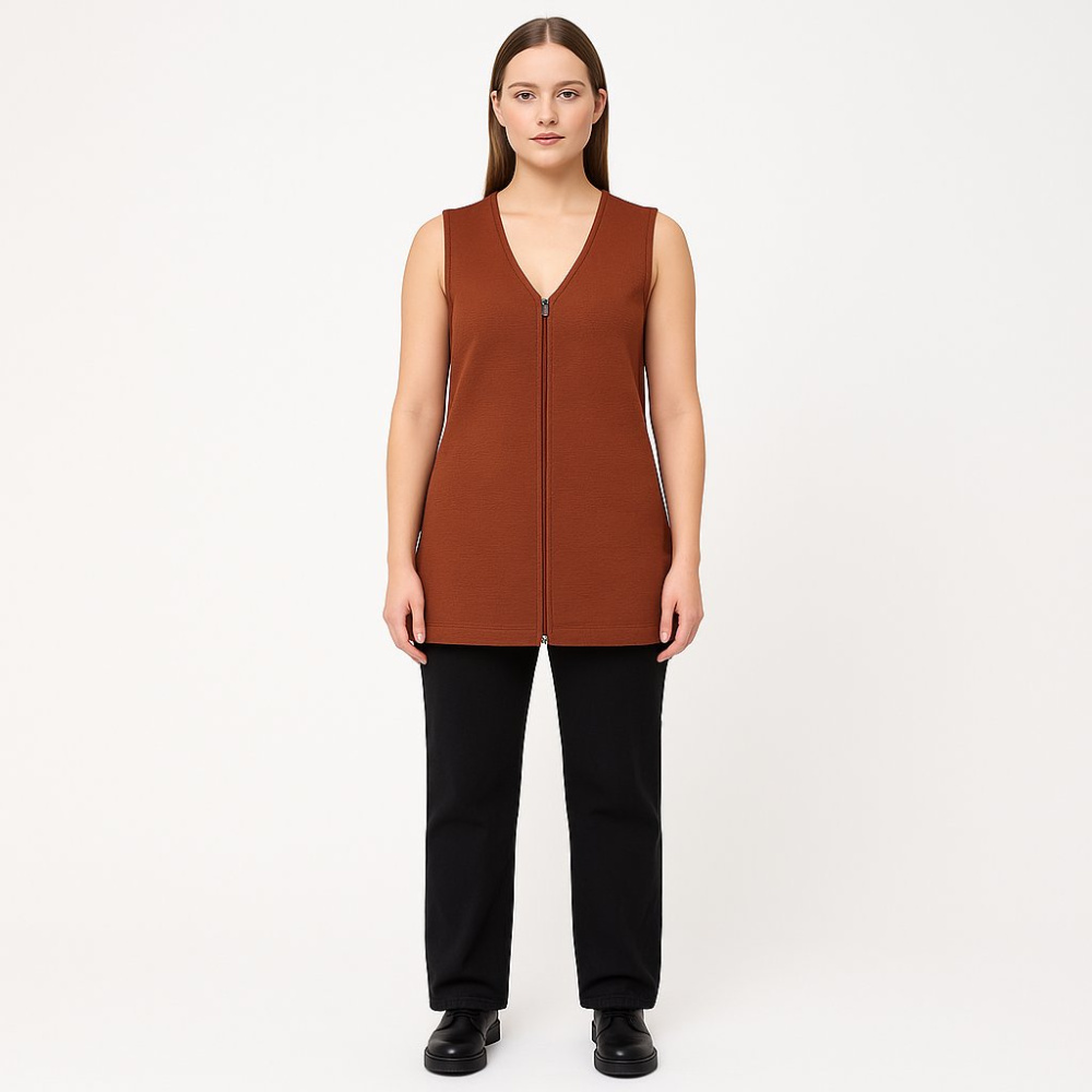 Женская кофта без рукавов на молнии из плотного трикотажа. Подойдёт для повседневных образов в прохладную погоду, удобно носить поверх топа или водолазки. Практичный плюс — материал из полиэстера прост в уходе и быстро сохнет.