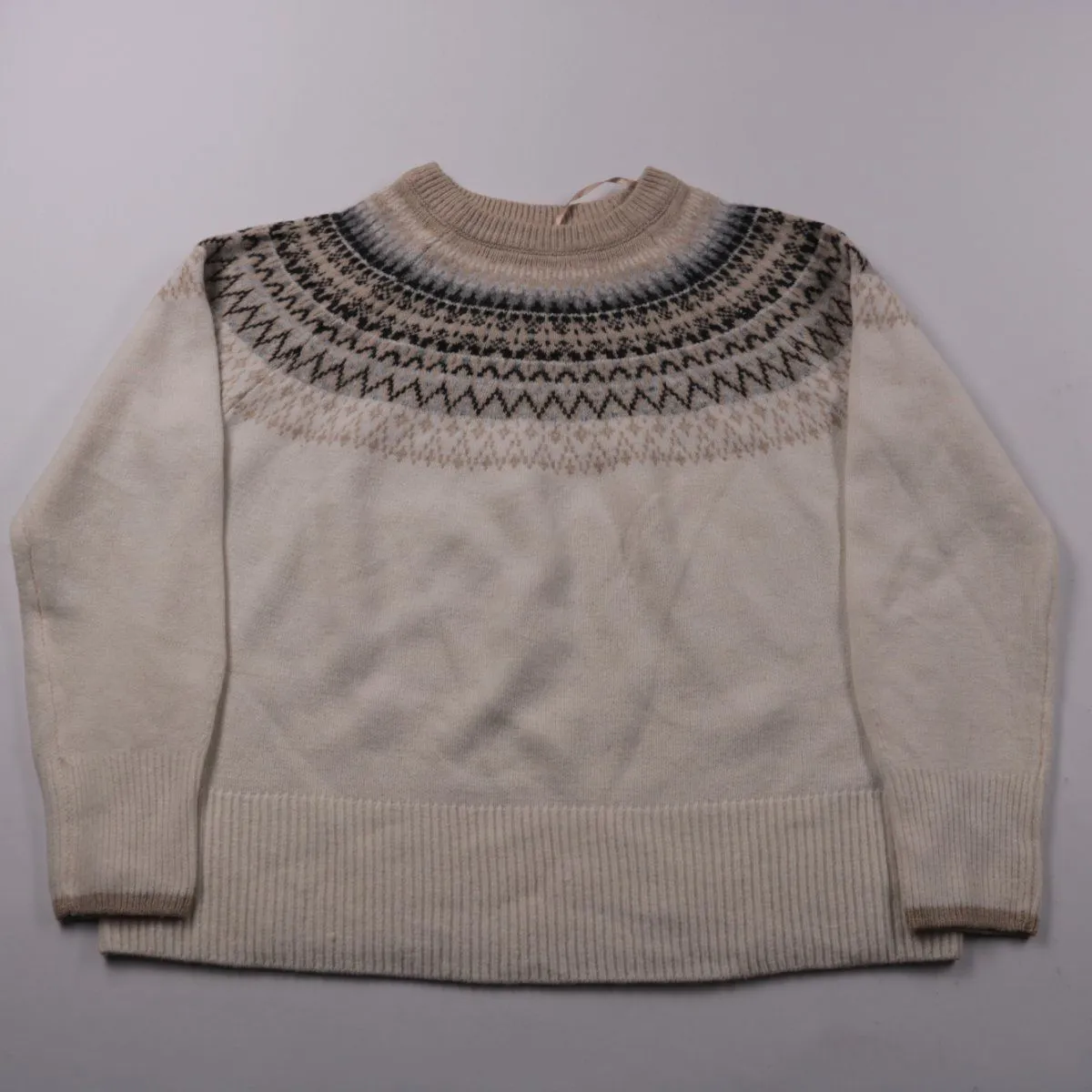 Женский свитер Dunnes молочного цвета с жаккардовым узором по кокетке и круглым вырезом. Подойдёт для повседневных образов в прохладную погоду, хорошо смотрится с джинсами и юбками. Практичный смесовый состав (полиэстер/акрил/шерсть с эластаном) прост в уходе и держит форму.