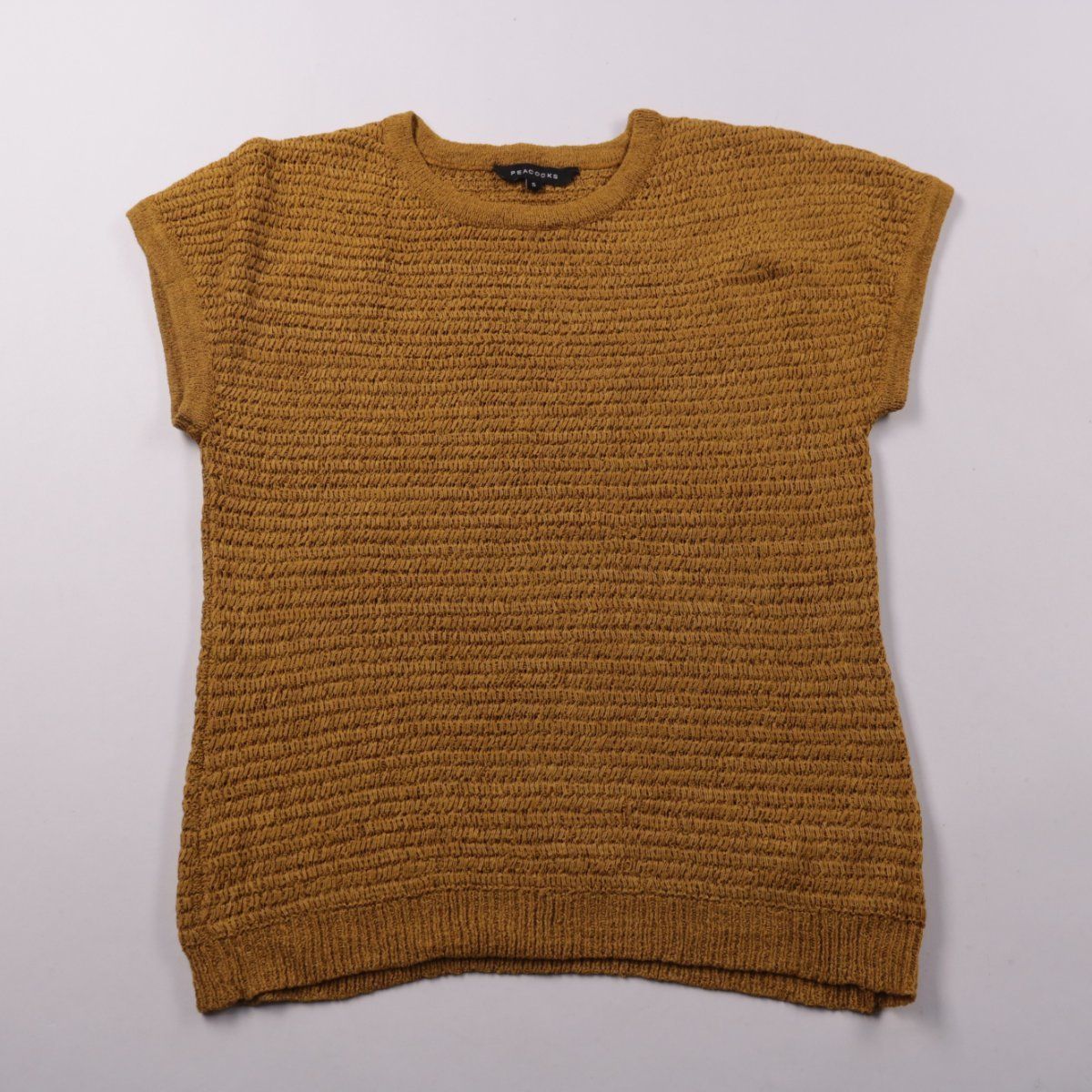 Женский джемпер Peacocks горчичного цвета с фактурной вязкой и коротким рукавом. Подойдёт для повседневных образов и офиса в прохладную погоду, хорошо сочетается с джинсами и юбками. Практичный плюс — немнущийся смесовый материал и комфортная посадка.
