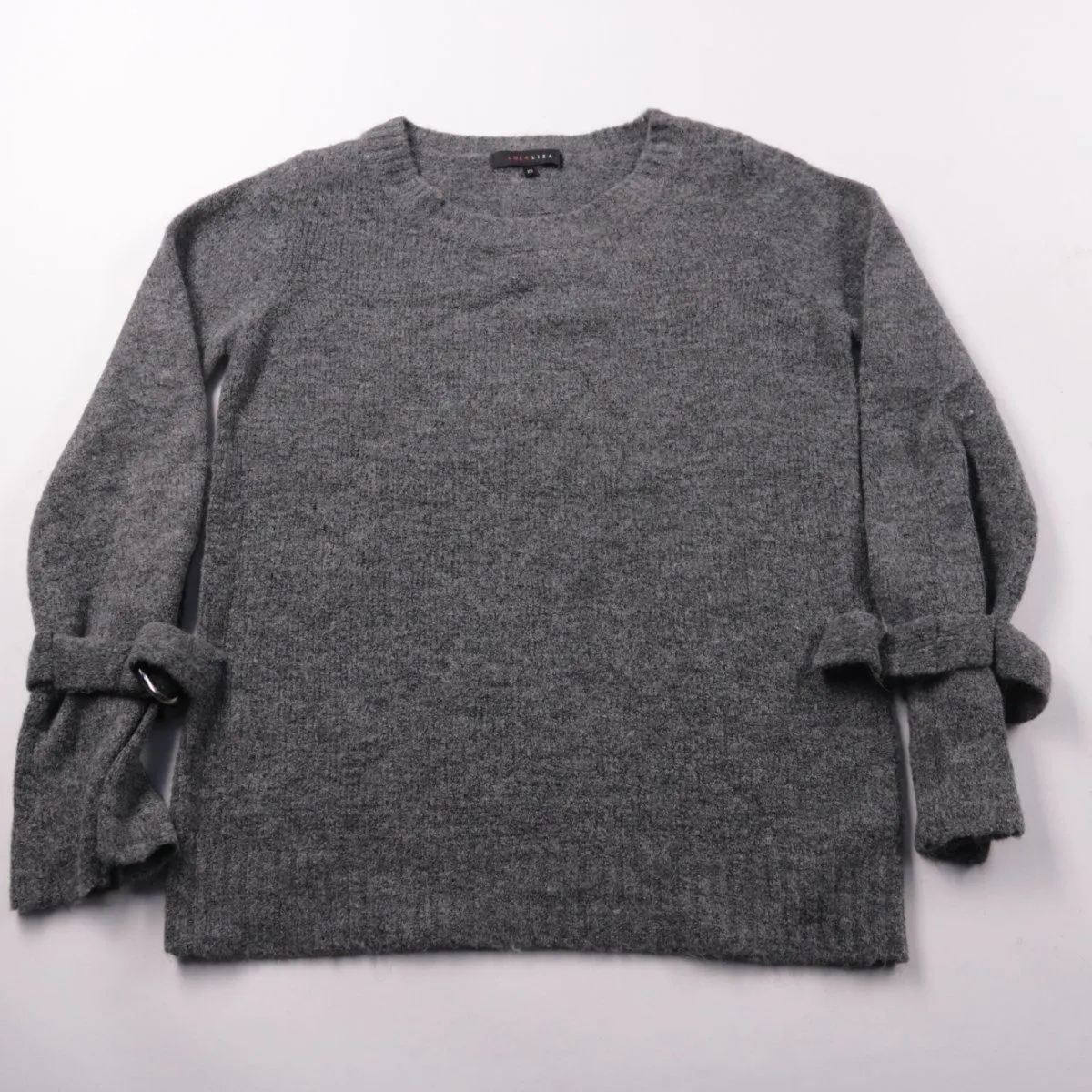 Женский джемпер LOLALIZA серого меланжа с круглым вырезом и акцентными рукавами на завязках. Подойдёт для повседневных образов в прохладную погоду, хорошо сочетается с джинсами и юбками. Мягкий трикотаж комфортно носится и не сковывает движения.