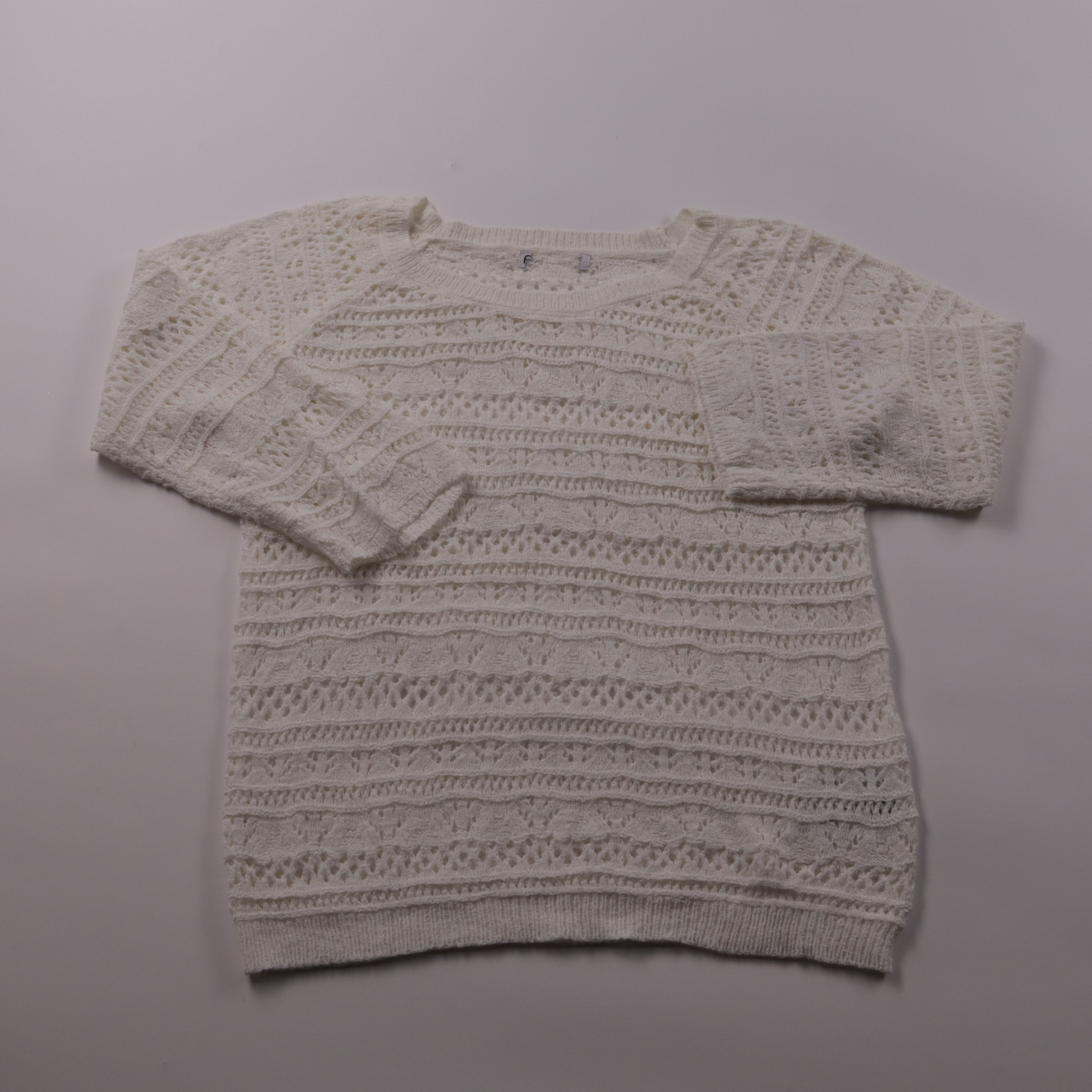 Вязаный свитер без бренда, белого (молочного) цвета с ажурным узором и круглым вырезом. Подойдёт для прохладных летних вечеров и демисезона, хорошо смотрится в многослойных образах поверх топа. Лёгкая вязка даёт вентиляцию и комфорт при носке.
