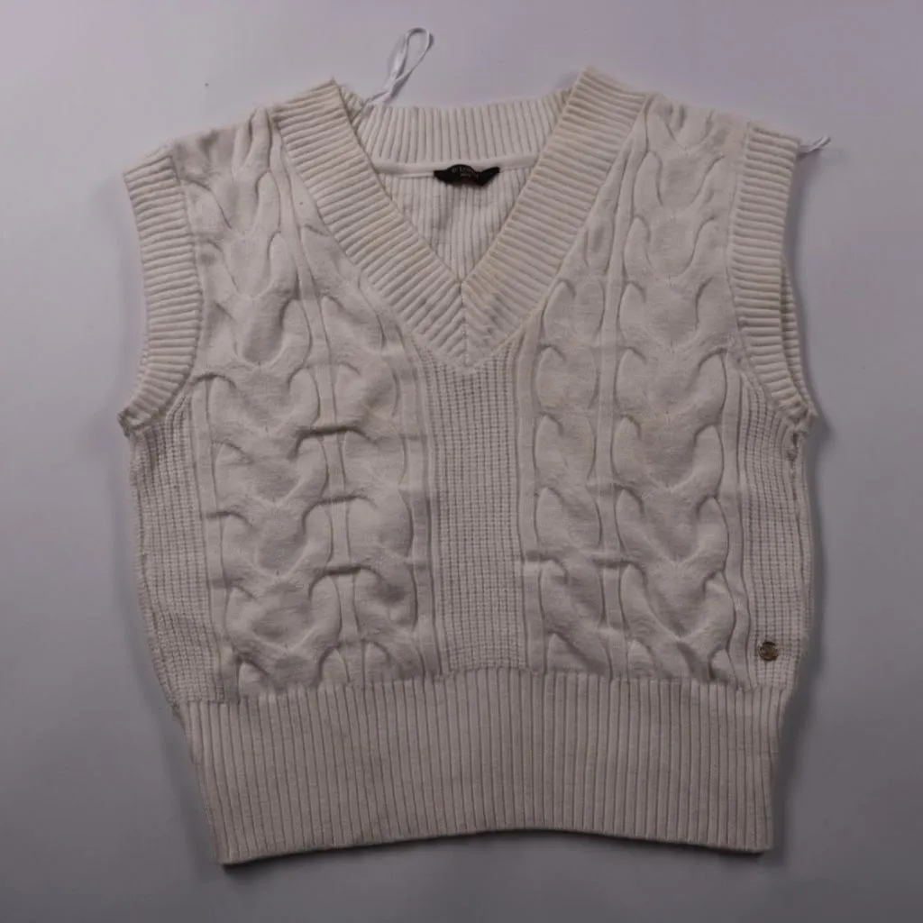 Трикотажный джемпер-жилет Di Loren молочного цвета с V-образным вырезом и фактурной вязкой «косы». Подойдёт для многослойных образов поверх рубашки или лонгслива в офис и на каждый день. Практичный плюс — плотная вязка хорошо держит форму и согревает, ...