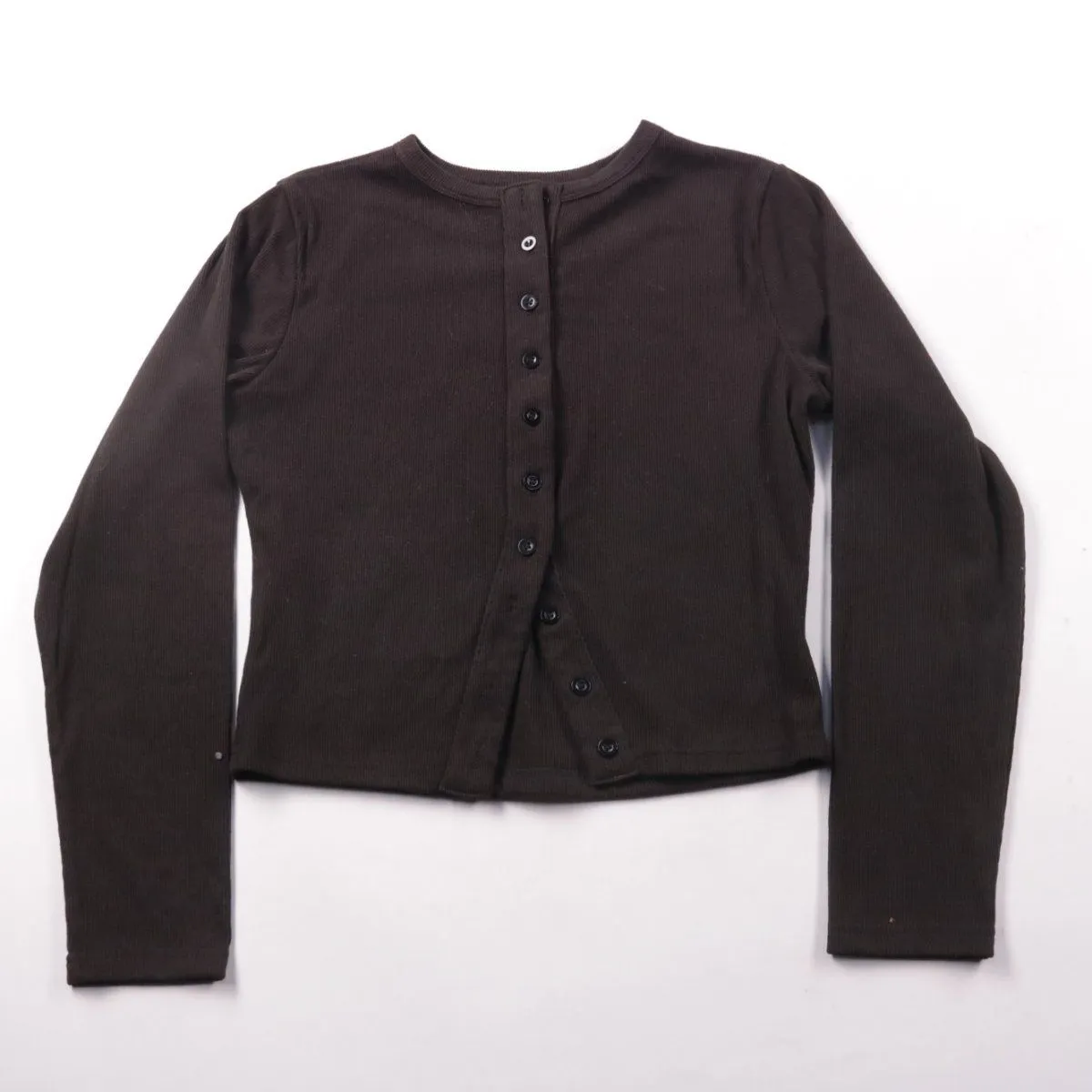 Укороченный женский кардиган на пуговицах в чёрном цвете, выполнен из ребристого трикотажа. Подойдёт для повседневных образов и многослойных комплектов в прохладную погоду. Эластичная ткань хорошо тянется и комфортно садится по фигуре.