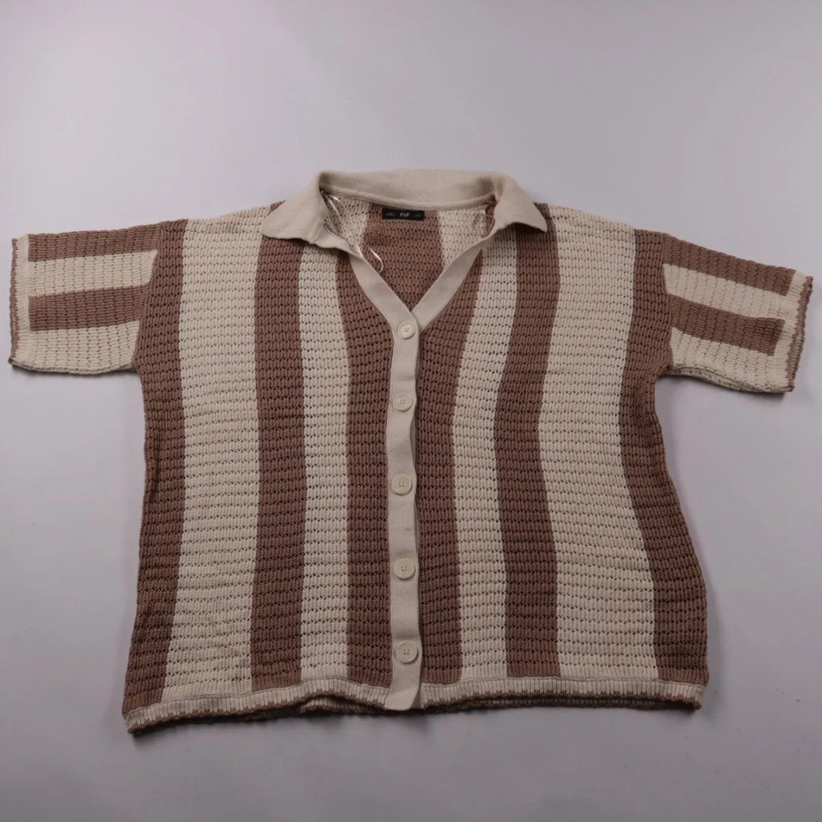 Вязаный кардиган F&F в бежево-коричневую полоску, с воротником и застёжкой на пуговицы. Подойдёт для тёплой погоды и многослойных образов в стиле casual. Практичен тем, что легко сочетается с базовыми топами и джинсами/брюками.