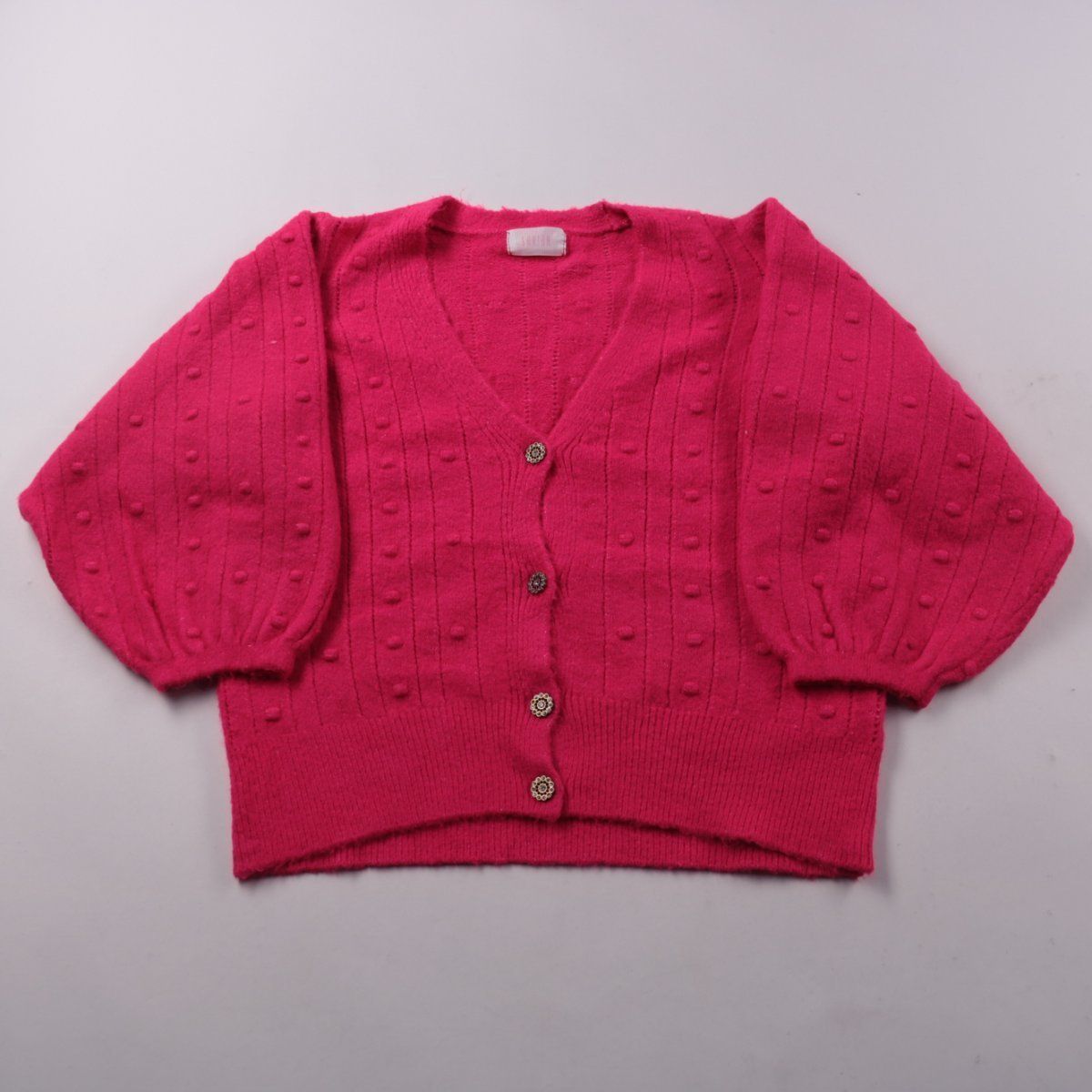 Вязаный кардиган Savida ярко-розового цвета с V-образным вырезом и декоративной фактурной вязкой, застёгивается на пуговицы. Подойдёт для повседневных образов в прохладную погоду и для многослойных сочетаний. Удобен тем, что легко надевается поверх топов и платьев и не сковывает движения.