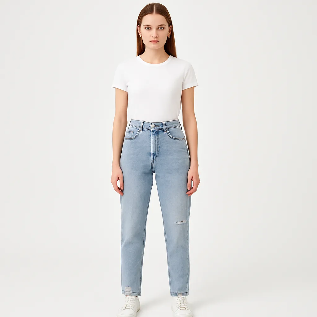 Женские джинсы Fb Sister в светло-голубом дениме, Mom’s Fit с высокой посадкой. Подойдут на каждый день и для базовых образов с футболками, рубашками и кедами. Плотный 100% хлопок хорошо держит форму и комфортен в носке.