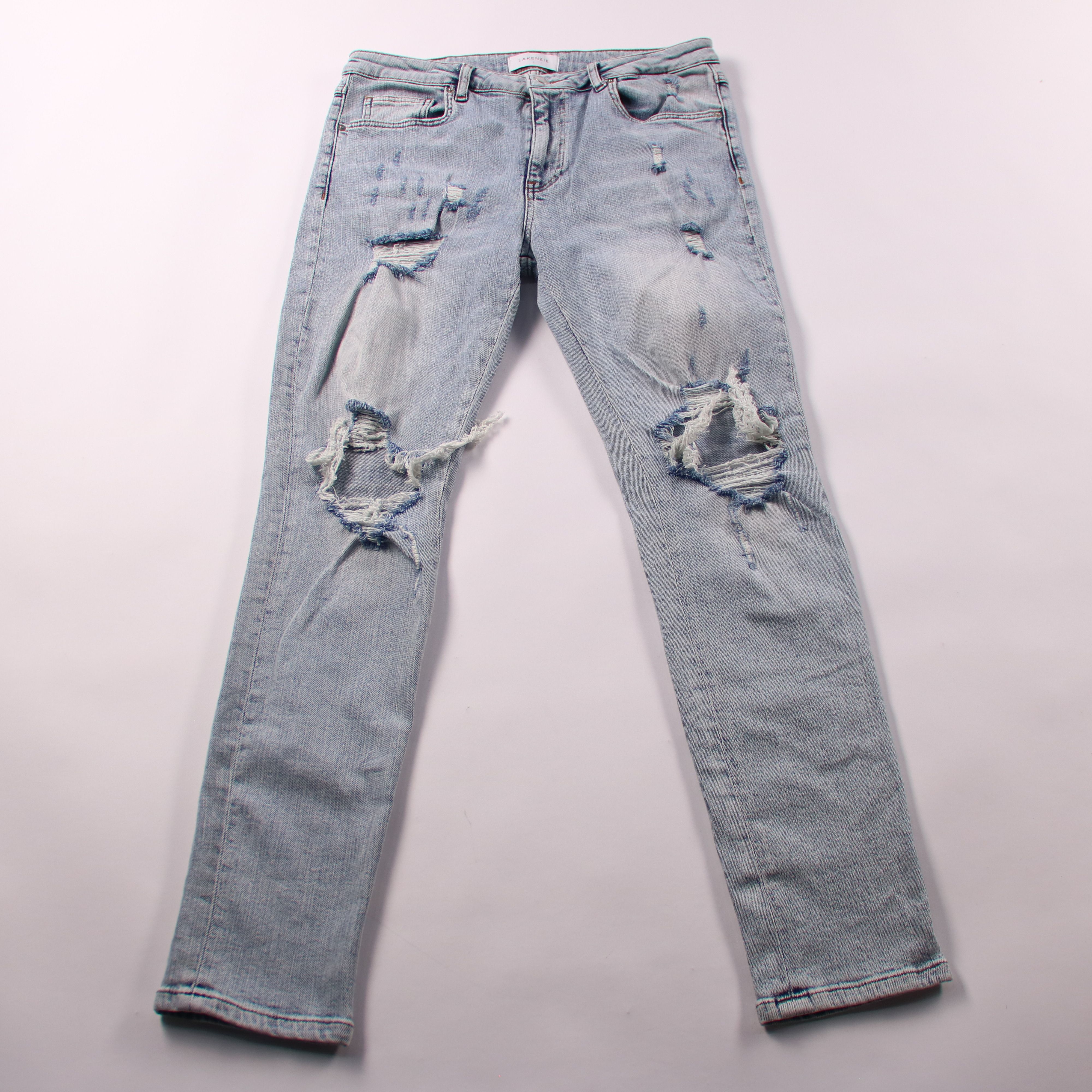 Джинсы Lakenzie светло-голубого цвета с декоративными потертостями и разрывами. Подойдут для повседневных образов и стритстайла в тёплое время или в помещении круглый год. Плотный деним с добавлением эластана чуть тянется и комфортнее садится по фигуре.