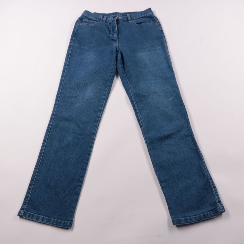 Женские джинсы классического синего цвета, прямого кроя. Подойдут для повседневных образов с футболками, свитшотами и рубашками. Практичный плотный деним хорошо носится и легко сочетается с любой обувью.