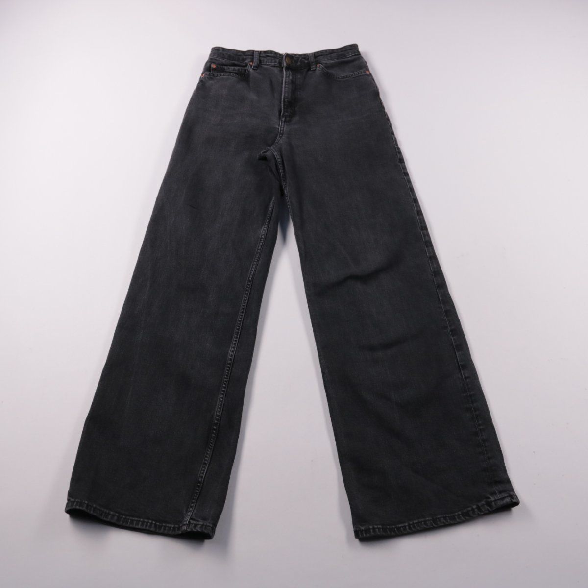 Женские джинсы из чёрного денима с высокой посадкой и широкими штанинами. Подойдут для повседневных образов и на выход — легко сочетаются с футболками, рубашками и жакетами. Плотная ткань хорошо держит форму и комфортна в носке.