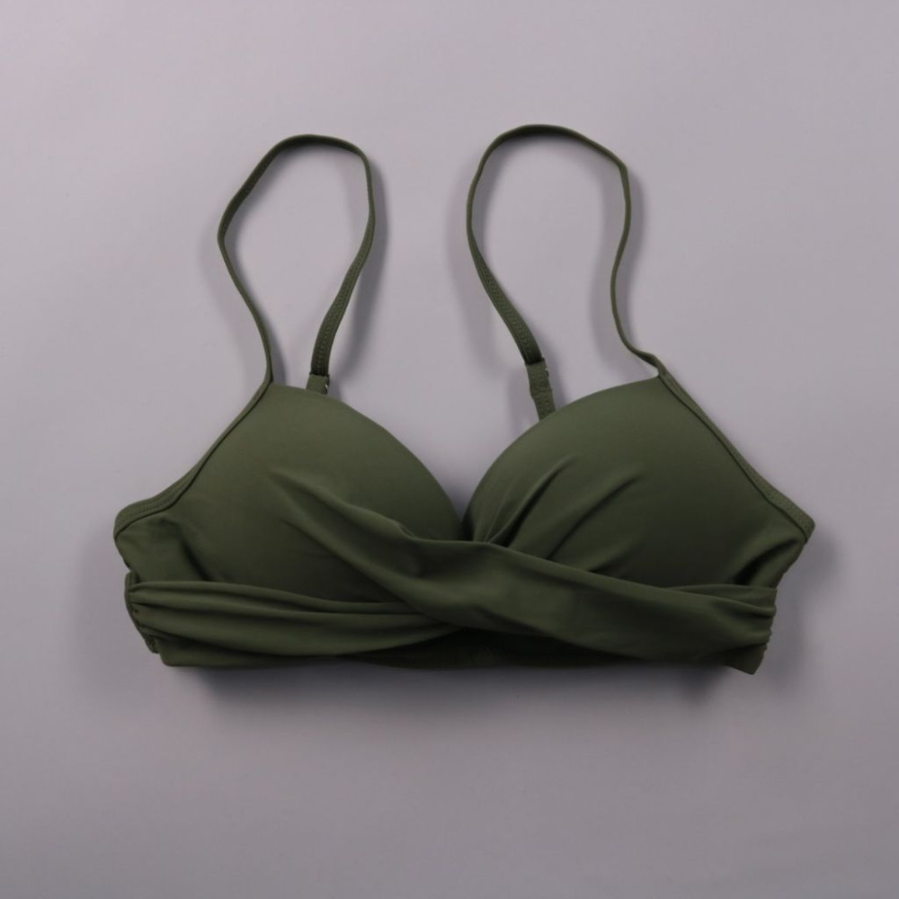 Женский лиф от купальника с перекрутом спереди и формованными чашками, бренд на бирке не указан. Подойдёт для пляжа и бассейна, бретели регулируются. Быстро сохнет и хорошо тянется благодаря эластичной ткани.