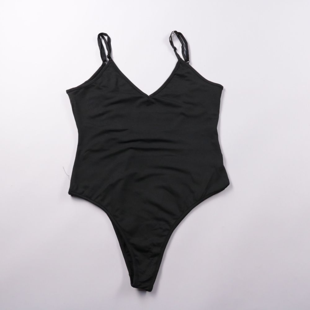 Слитный женский купальник чёрного цвета с V-образным вырезом и тонкими регулируемыми бретелями. Подойдёт для бассейна и пляжа, хорошо смотрится как базовый вариант под накидку или шорты. Плотный материал быстро сохнет и не требует сложного ухода.