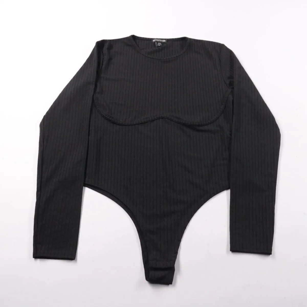 Женское боди PrettyLittleThing из чёрного рубчатого трикотажа с длинным рукавом и круглым вырезом. Подойдёт для повседневных образов с джинсами или юбкой и как базовый слой в прохладную погоду. Плотно сидит по фигуре и не выбивается из-под одежды.