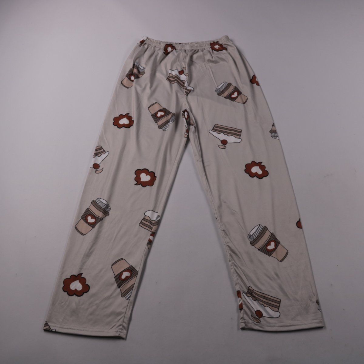 Женские пижамные брюки с эластичным поясом и принтом (кофе/десерты). Подойдут для сна и домашней носки, ткань тянется за счёт эластана. Лёгкие и быстро сохнут после стирки.