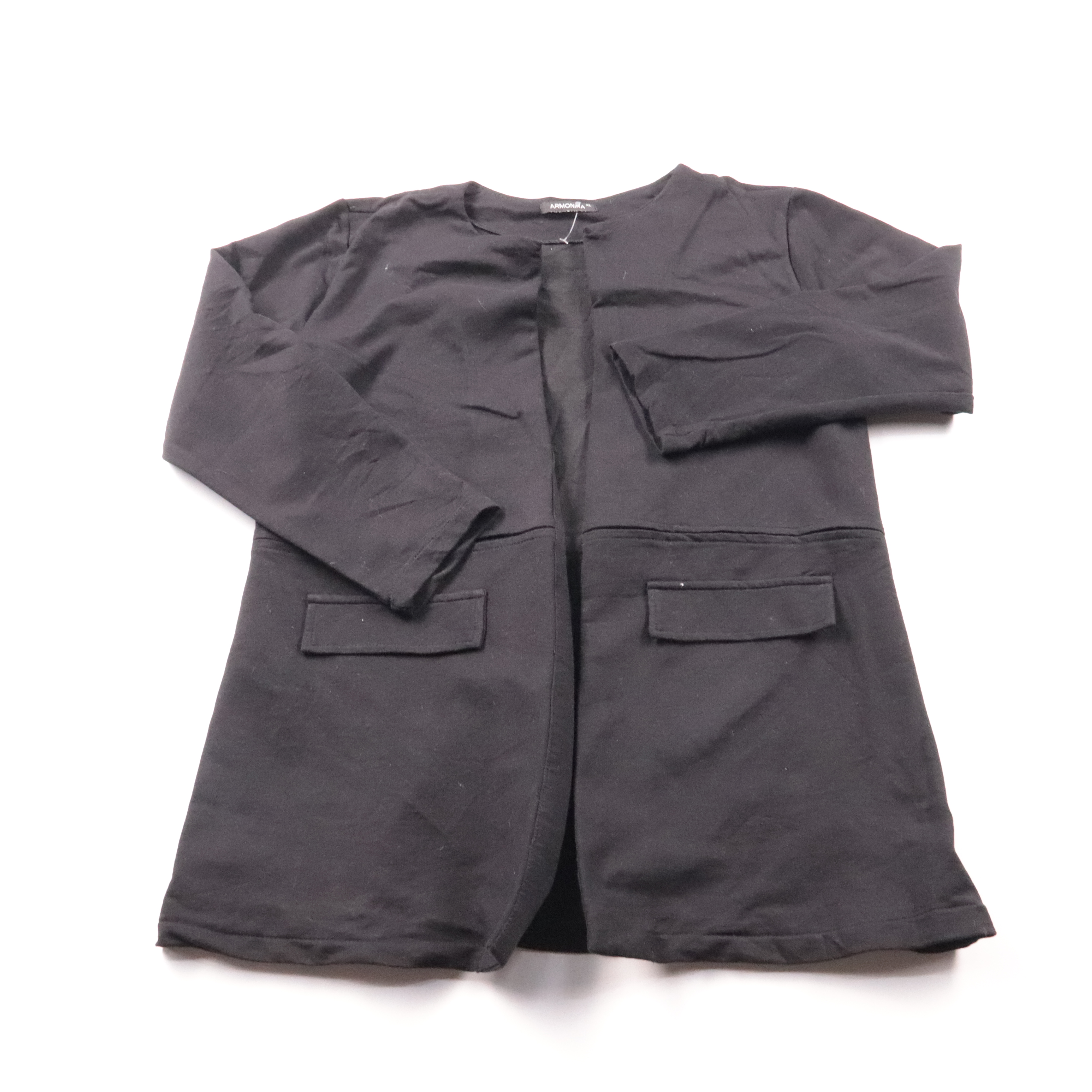 Женский пиджак Armonia чёрного цвета, без лацканов и с накладными карманами. Подойдёт для офиса и повседневных образов в демисезон. Практичен тем, что легко сочетается с базовыми вещами и не мнётся так заметно за счёт смесовой ткани.
