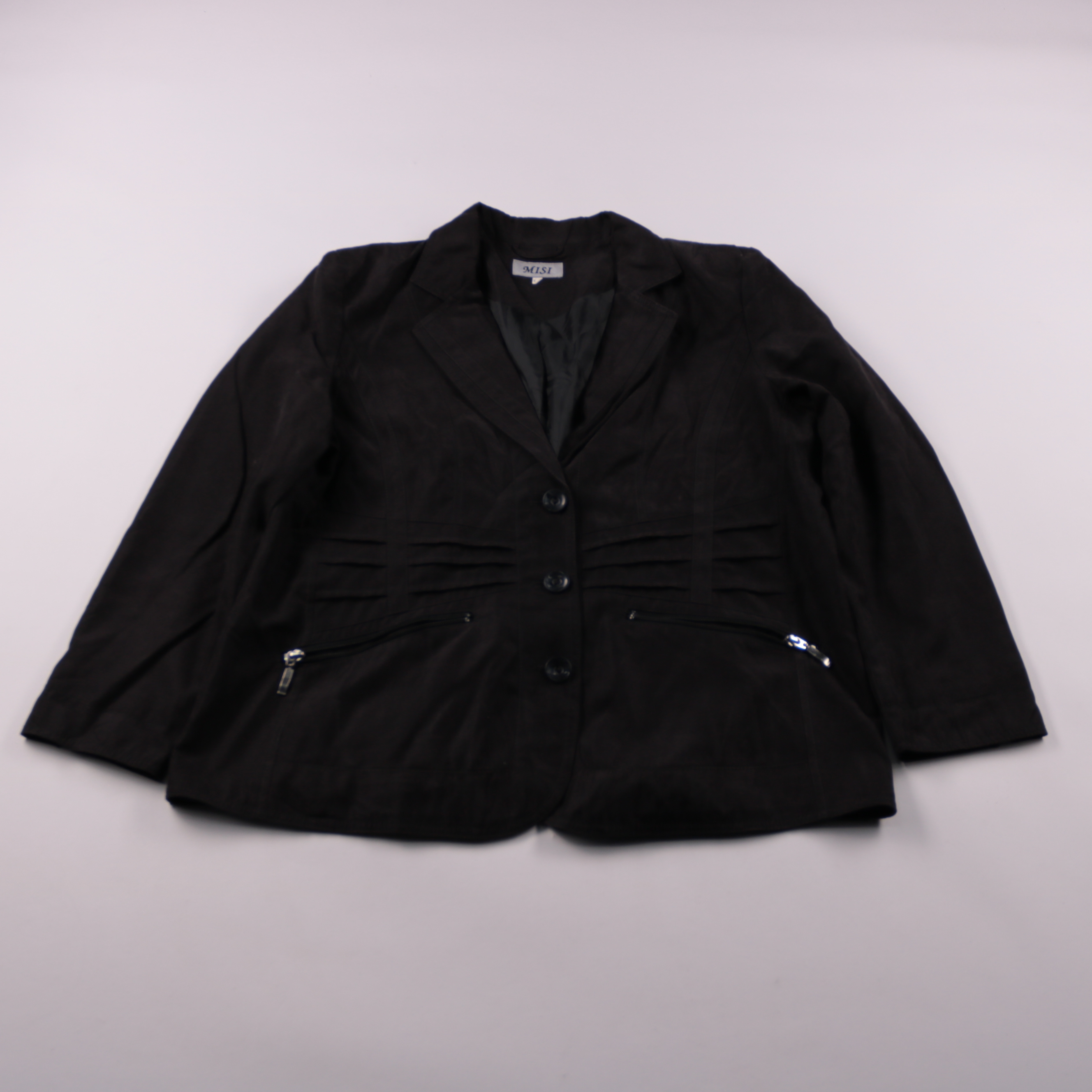 Женский пиджак Misi чёрного цвета с классическими лацканами и застёжкой на пуговицы, карманы на молниях. Подойдёт для офиса и повседневных образов с брюками или юбкой. Практичная немнущаяся ткань и подкладка делают его удобным в носке.