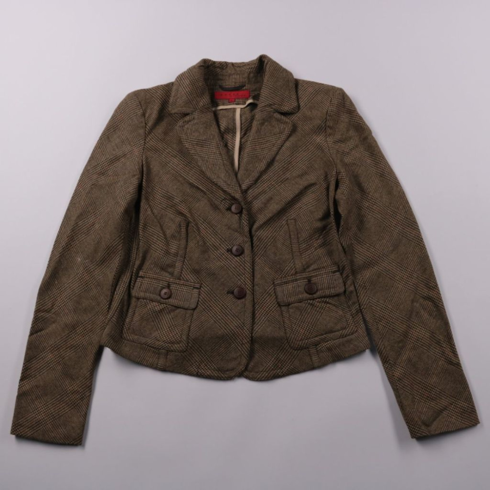 Женский пиджак Donna by Wallhoher в коричневую клетку, приталенного силуэта на пуговицах и с накладными карманами. Подойдёт для офиса и повседневных образов с джинсами или брюками в демисезон. Практичное преимущество — комфортная ткань с эластаном и по...