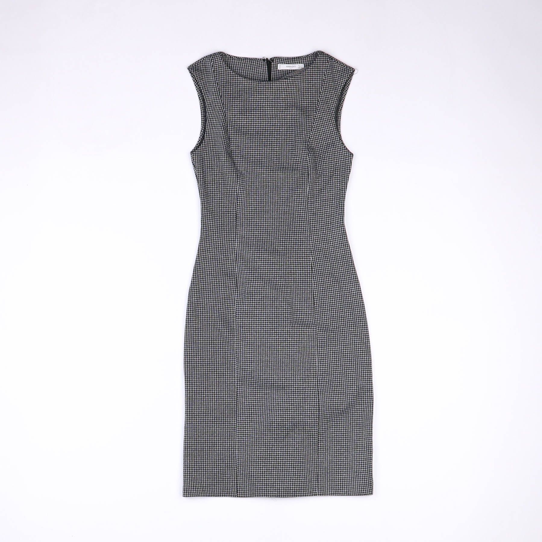 Платье-футляр Mango без рукавов в мелкую черно-белую клетку, с вытачками и молнией сзади. Подойдет для офиса, встреч и повседневных образов с жакетом или кардиганом. Плотная ткань хорошо держит форму и аккуратно садится по фигуре.
