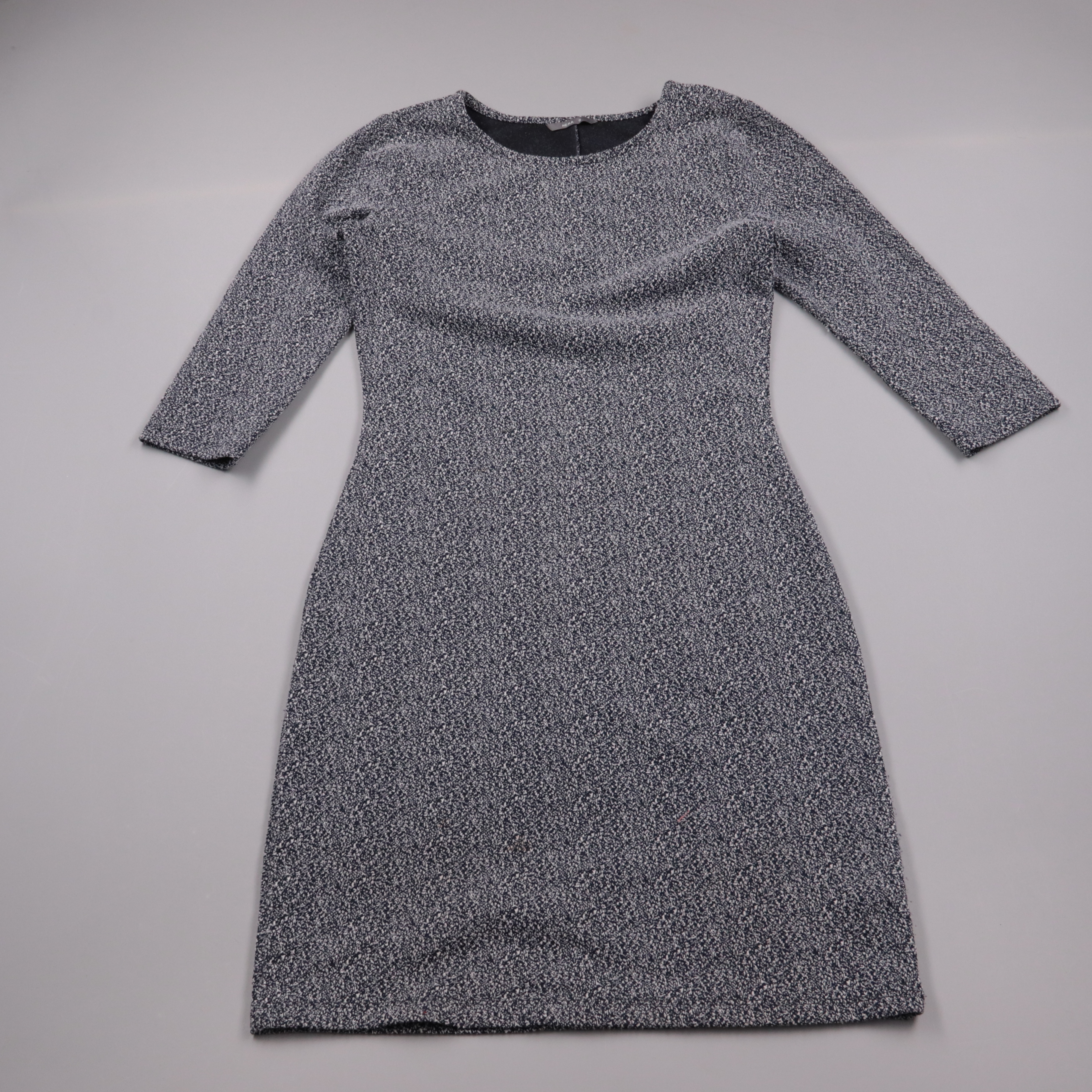 Повседневное платье HEMA прямого кроя из мягкого меланжевого трикотажа с рукавом 3/4. Подойдёт для офиса и на каждый день, хорошо смотрится с ботильонами или кедами. Ткань слегка тянется благодаря эластану и комфортно садится по фигуре.