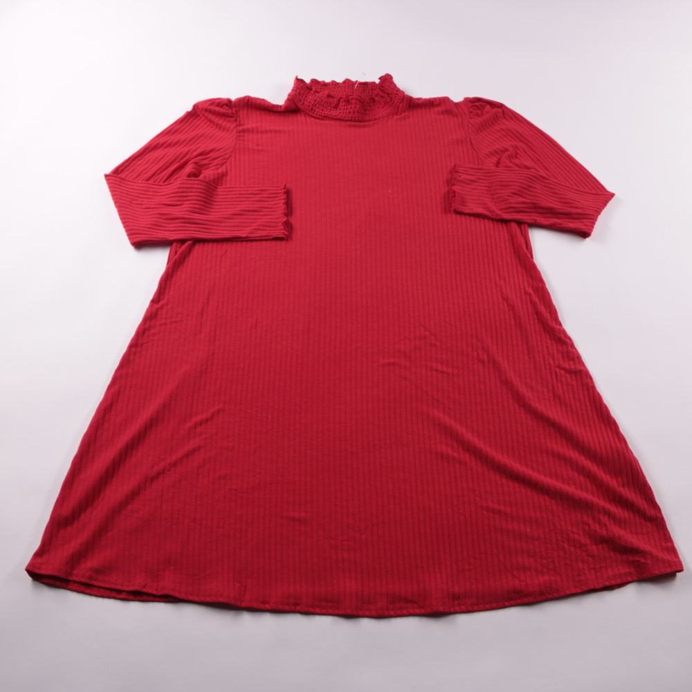 Повседневное платье New Look красного цвета из трикотажа в рубчик с рукавом 3/4 и воротником-стойкой с оборкой. Подойдёт на каждый день, в офис или на прогулку, легко сочетается с кедами и ботильонами. Материал тянется и комфортно садится по фигуре.
