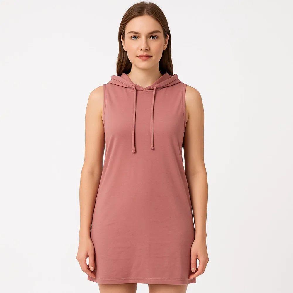 Повседневное платье Shein без рукавов с капюшоном и кулиской, в пыльно-розовом цвете. Подойдёт для прогулок и повседневных дел в тёплую погоду, легко сочетается с кедами и сандалиями. Материал тянется и не мнётся, удобно в уходе.
