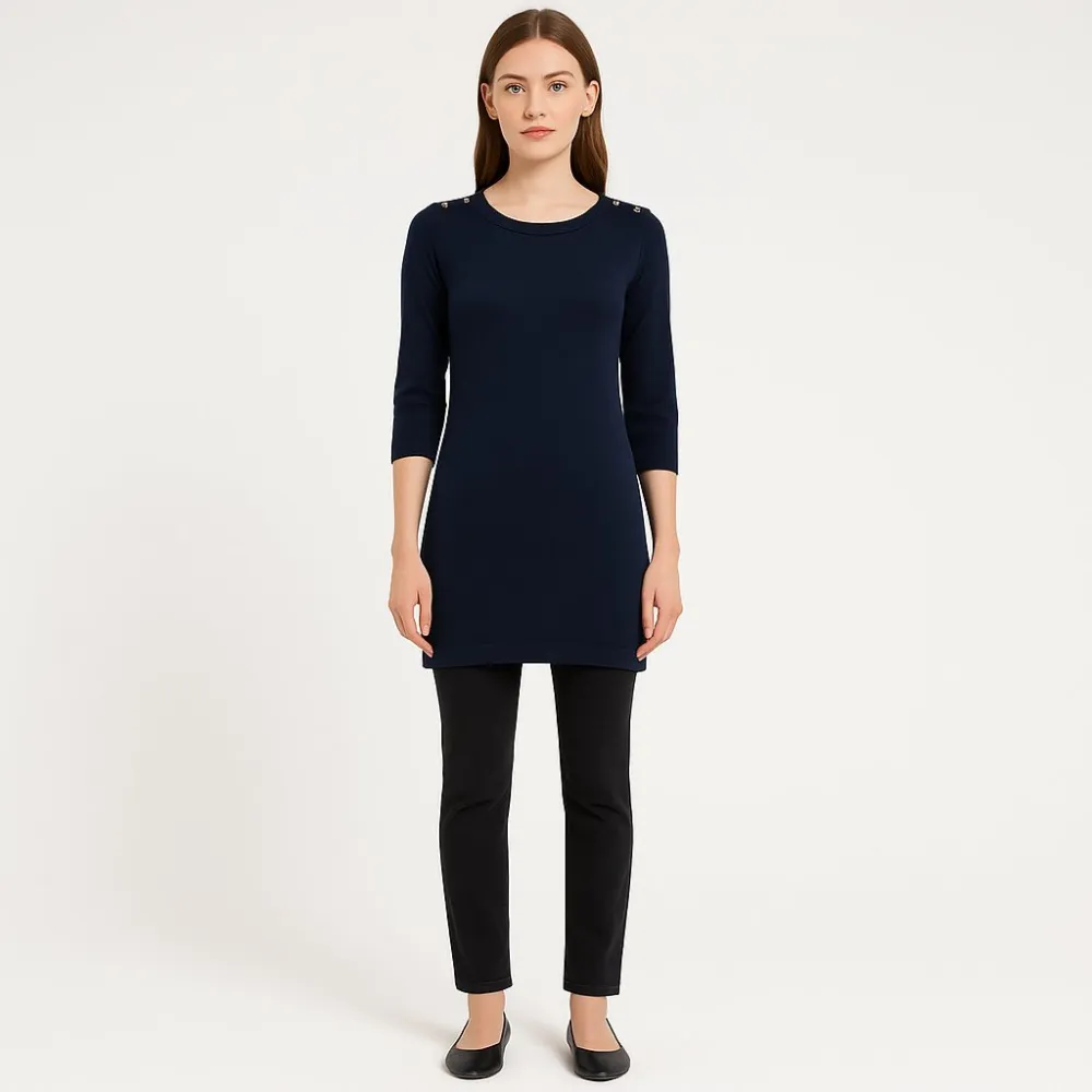 Повседневное платье Orsay прямого кроя тёмно-синего цвета с рукавом 3/4 и декоративными пуговицами на плечах. Подойдёт для офиса и на каждый день, легко сочетается с балетками или ботильонами. Практичный трикотаж комфортно тянется и не сковывает движения.