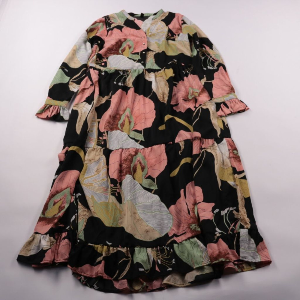 Повседневное платье Y.A.S с цветочным принтом на чёрном фоне, ярусным кроем и рукавами 3/4 с воланами. Подойдёт для прогулок и офиса в тёплую весну/осень, легко сочетается с ботинками или кедами. Свободный силуэт не сковывает движения и комфортен на ве...