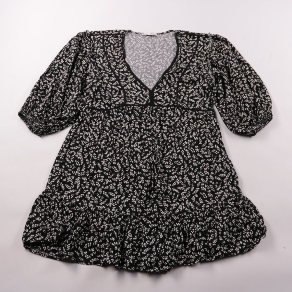 Лёгкое повседневное платье Pull&Bear чёрного цвета с мелким белым принтом, с V-образным вырезом и рукавами 3/4 на резинке. Подойдёт для прогулок и на каждый день в тёплую погоду, хорошо сочетается с кедами или босоножками. Вискоза приятная к телу и хор...