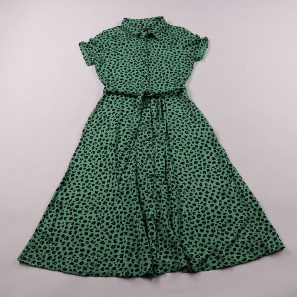 Повседневное платье-рубашка King Louie зелёного цвета с леопардовым принтом, коротким рукавом и поясом на талии. Подойдёт для летних прогулок и офиса в стиле casual, хорошо сочетается с кедами или босоножками. Трикотажная вискоза с эластаном мягко сади...