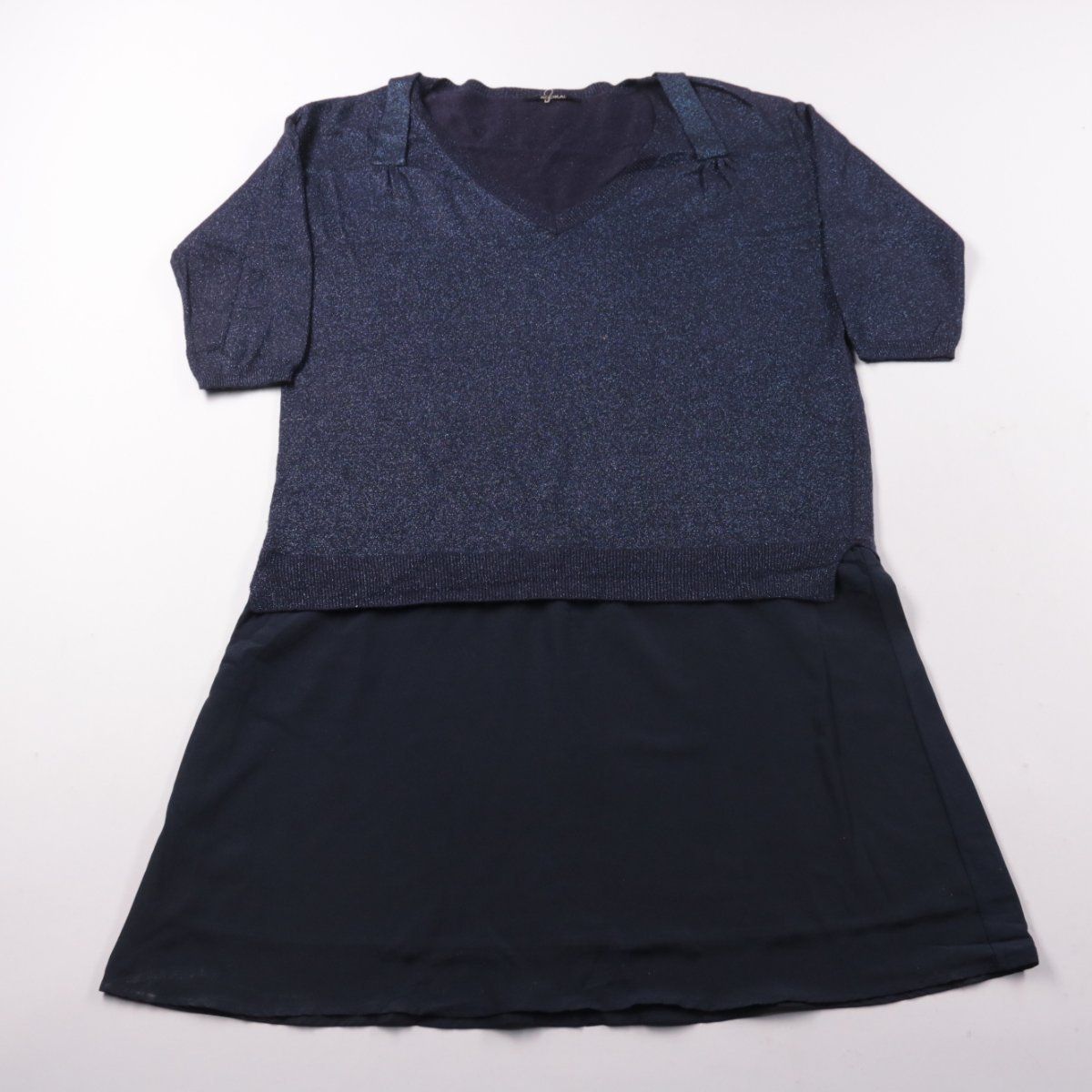 Повседневное платье Kookai темно-синего цвета с V-образным вырезом и коротким рукавом, верх выполнен из мягкого трикотажа с легким блеском. Подойдет для офиса и на каждый день, хорошо сочетается с ботильонами или туфлями. Практичный плюс — комбинированный крой и комфортная посадка без стеснения движений.