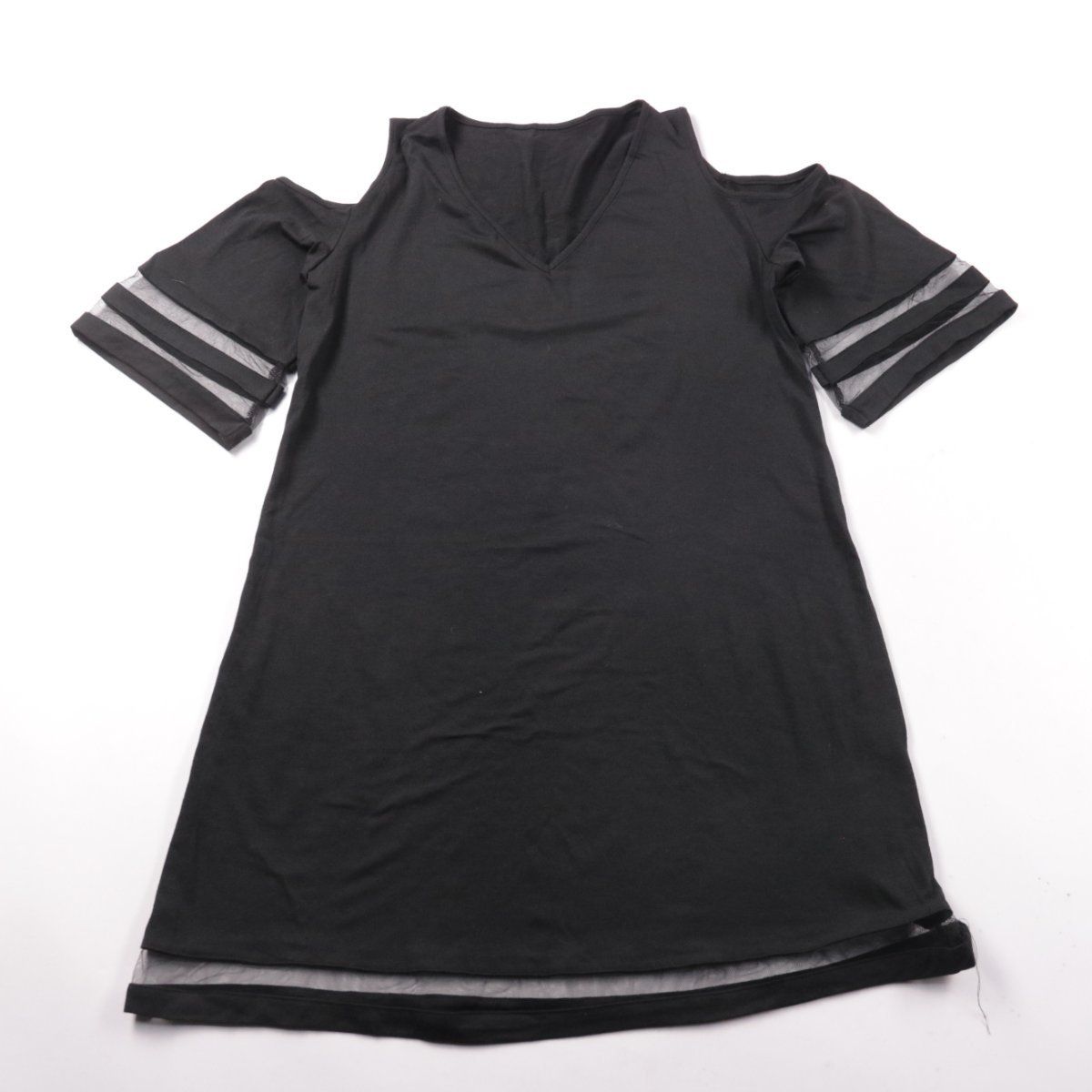 Женское повседневное платье прямого кроя с V-образным вырезом и вырезами на плечах. Рукава и низ оформлены полупрозрачными вставками, поэтому модель подойдёт для прогулок и повседневных выходов. Материал 100% полиэстер — быстро сохнет и почти не мнётся.