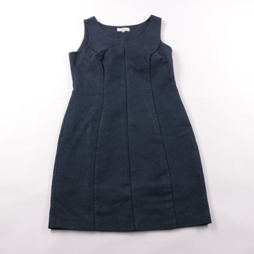 Повседневное платье Tom Tailor без рукавов, тёмно-синее с мелким фактурным узором и приталенными вытачками. Подойдёт для офиса и спокойных выходов, хорошо смотрится с жакетом или кардиганом. Плотная ткань держит форму и аккуратно сидит по фигуре.