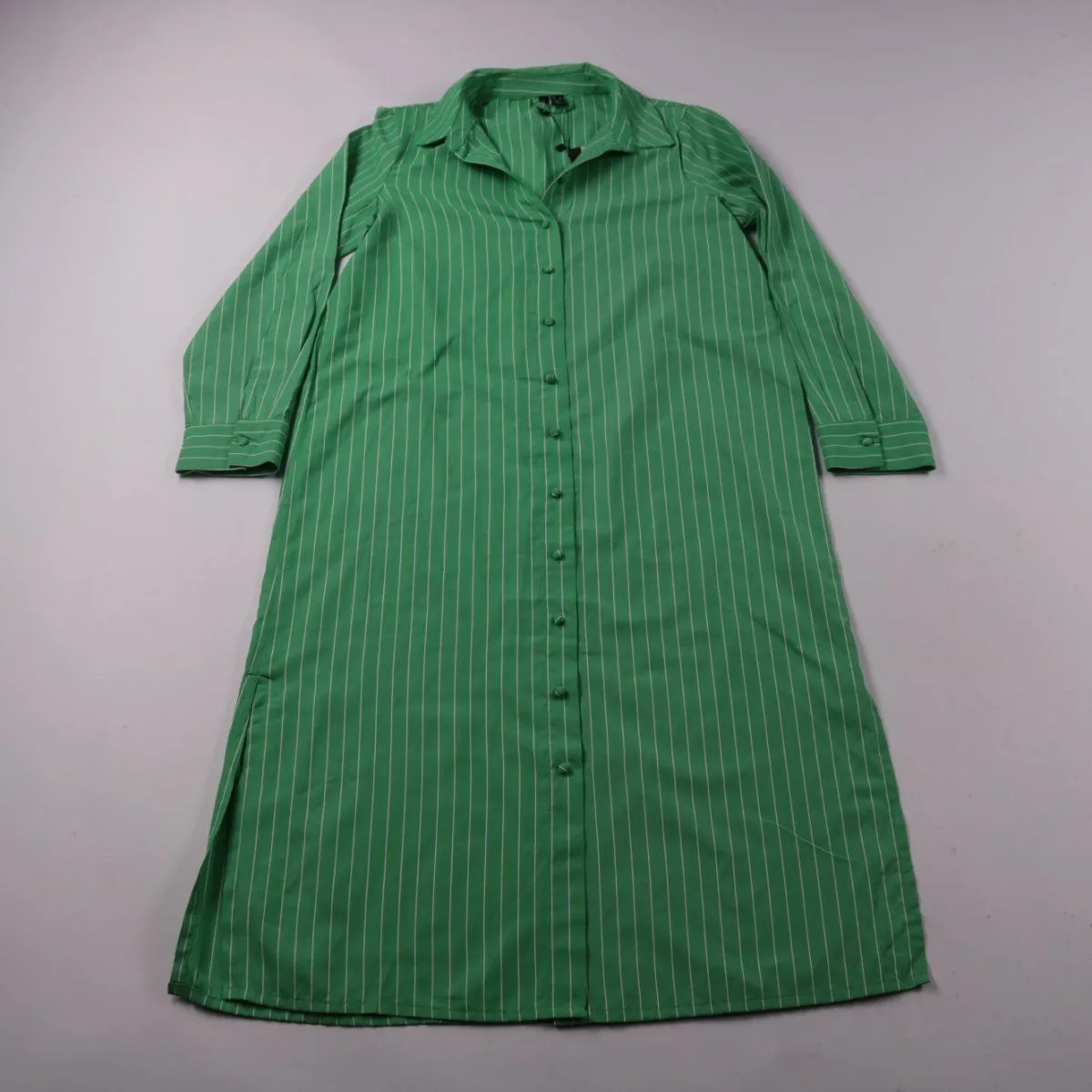 Повседневное платье-рубашка Vero Moda ярко-зелёного цвета в белую полоску, на пуговицах и с длинным рукавом. Подойдёт для офиса и на каждый день, можно носить как самостоятельное платье или с поясом/жилетом. Практичный плюс — смесовый хлопок меньше мнётся и проще в уходе.