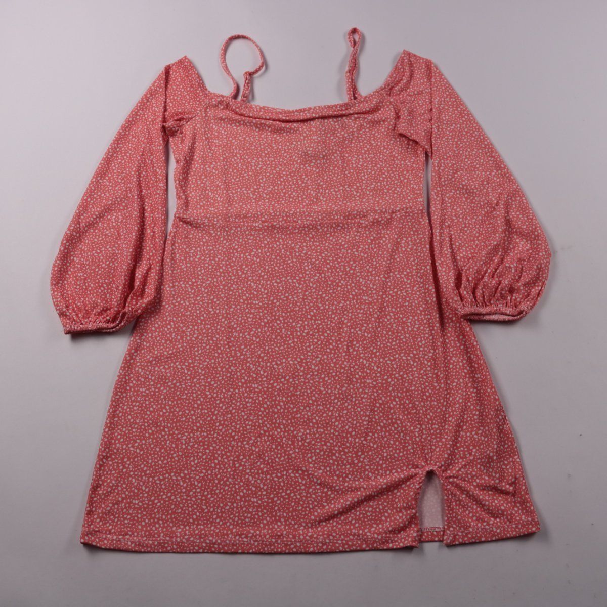 Повседневное платье NA-KD Reborn в розовом цвете с мелким белым принтом и квадратным вырезом, с длинными рукавами-фонариками и тонкими бретелями. Подойдёт для прогулок и встреч в тёплую погоду, хорошо смотрится с кедами или босоножками. Ткань тянется за счёт эластана и проста в уходе.