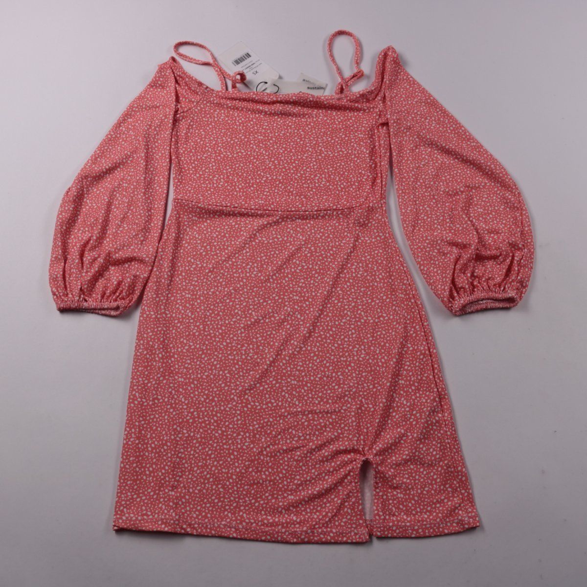 Повседневное платье NA-KD (PAMELA x NA-KD) розового цвета с мелким светлым принтом и квадратным вырезом. Длинные рукава с мягкой сборкой и акцентная драпировка снизу делают силуэт более выразительным. Подойдёт для прогулок и повседневных образов, ткань тянется и комфортно садится по фигуре.