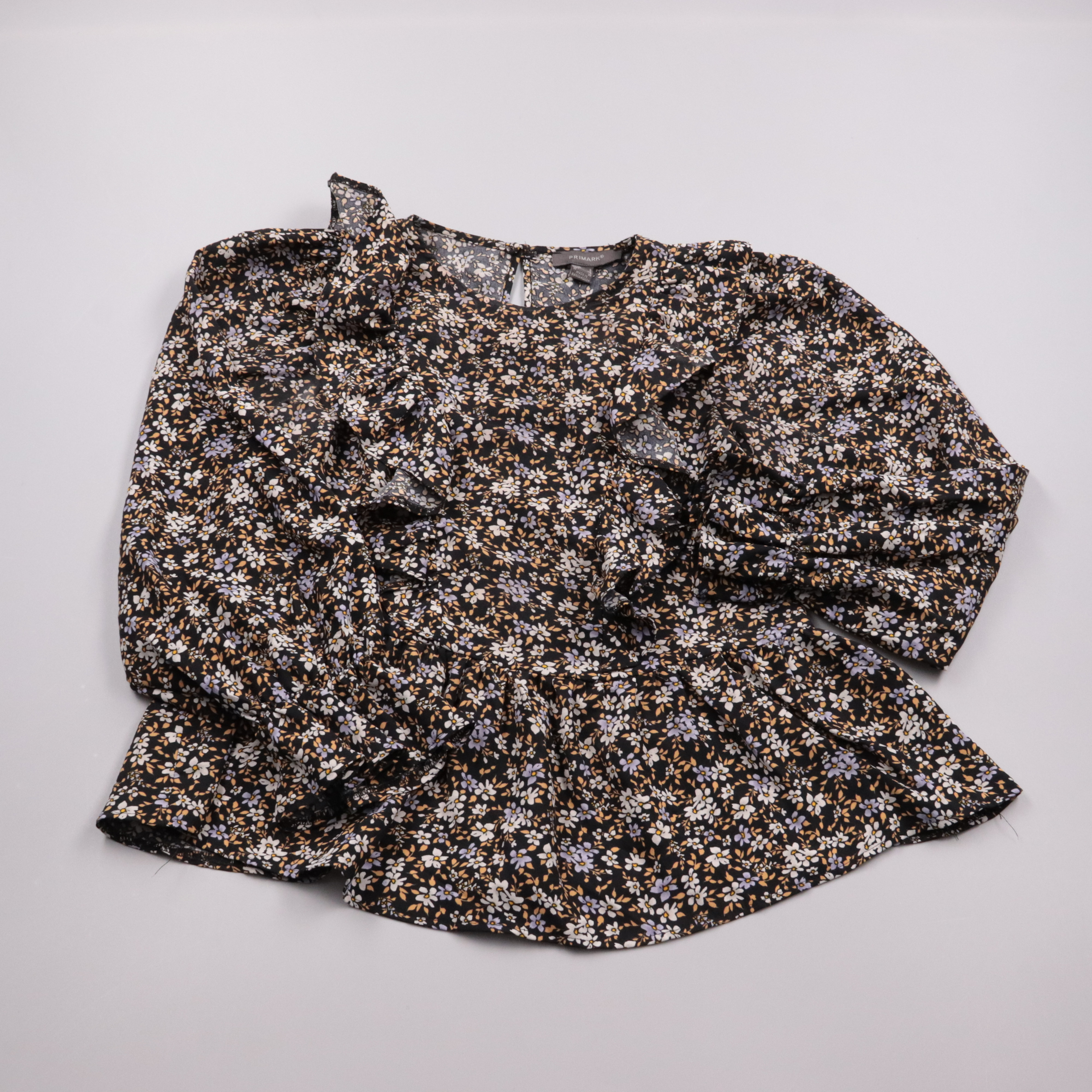 Женская блузка Primark с цветочным принтом и воланами по верху и низу. Подойдёт для повседневных образов с джинсами или юбкой в демисезон. Лёгкая ткань и свободная посадка делают её удобной в носке.