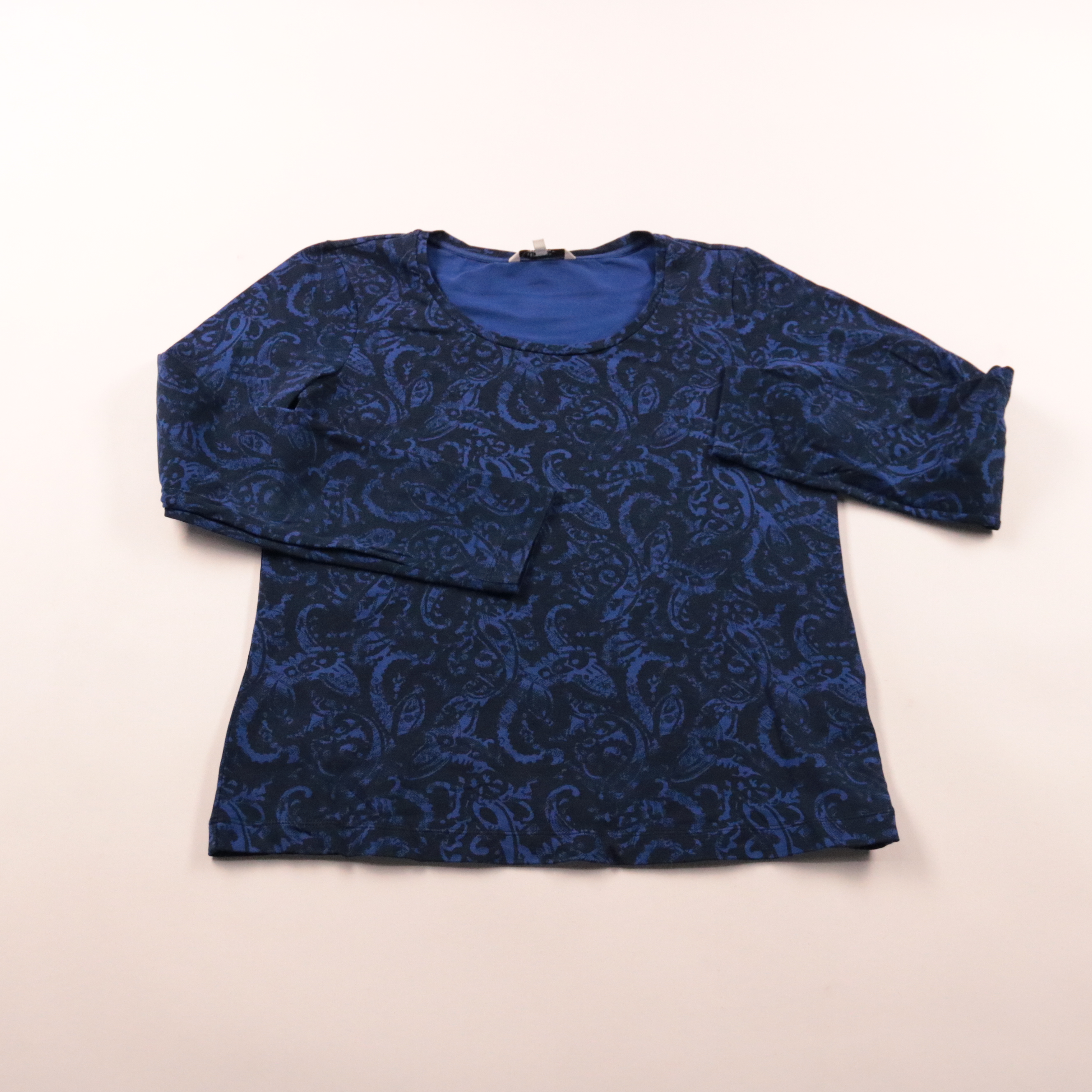 Блузка Sandwich из плотного трикотажа с фактурным узором пейсли в сине-чёрной гамме. Подойдёт для офиса и повседневных образов с брюками или джинсами, рукава 3/4 и округлый вырез смотрятся аккуратно. Материал тянется и комфортно садится по фигуре.