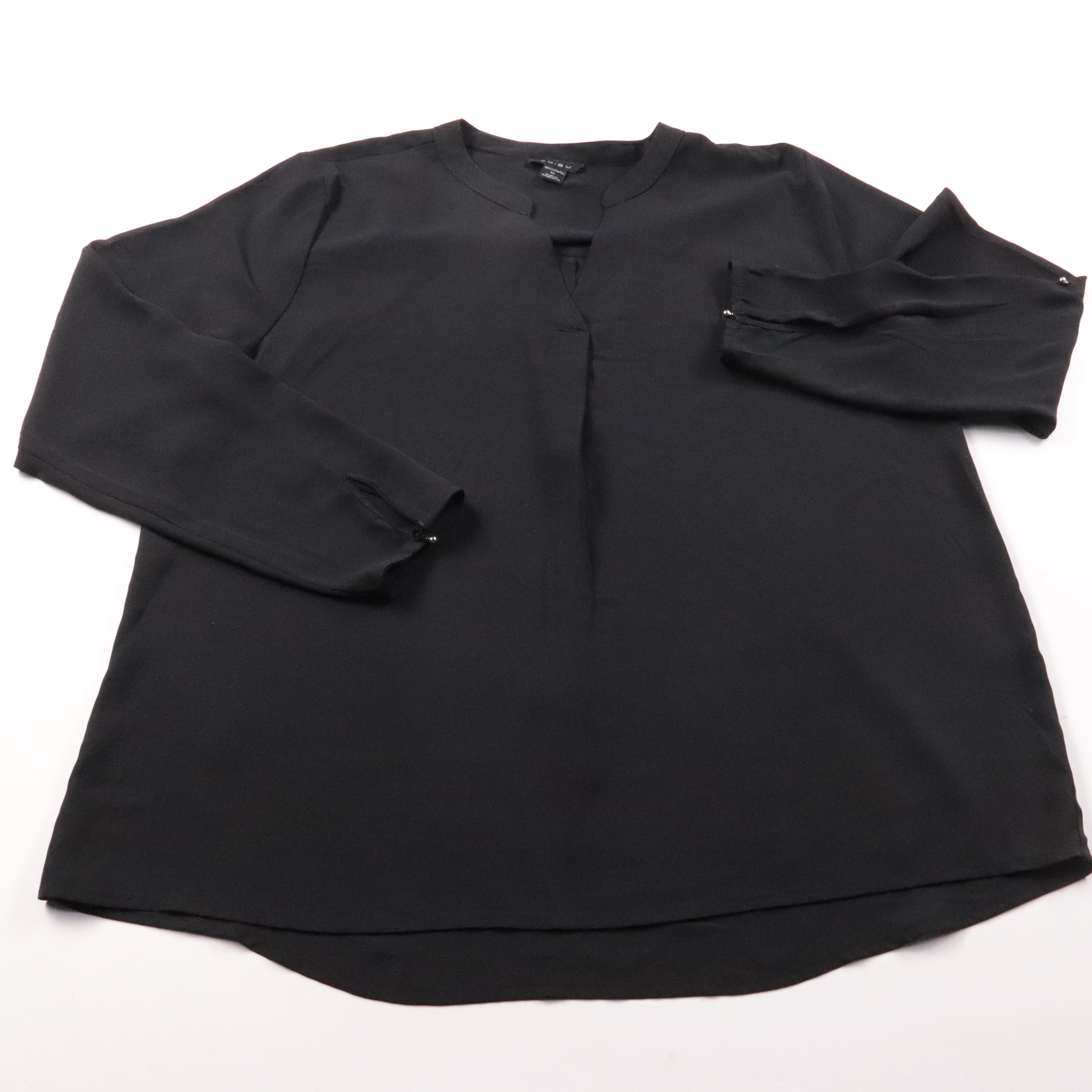 Блузка Amisu из гладкой чёрной ткани с V-образным вырезом и длинными рукавами. Подойдёт для офиса и повседневных образов, легко сочетается с брюками и юбками. Практичный плюс — немаркий цвет и универсальный лаконичный дизайн.