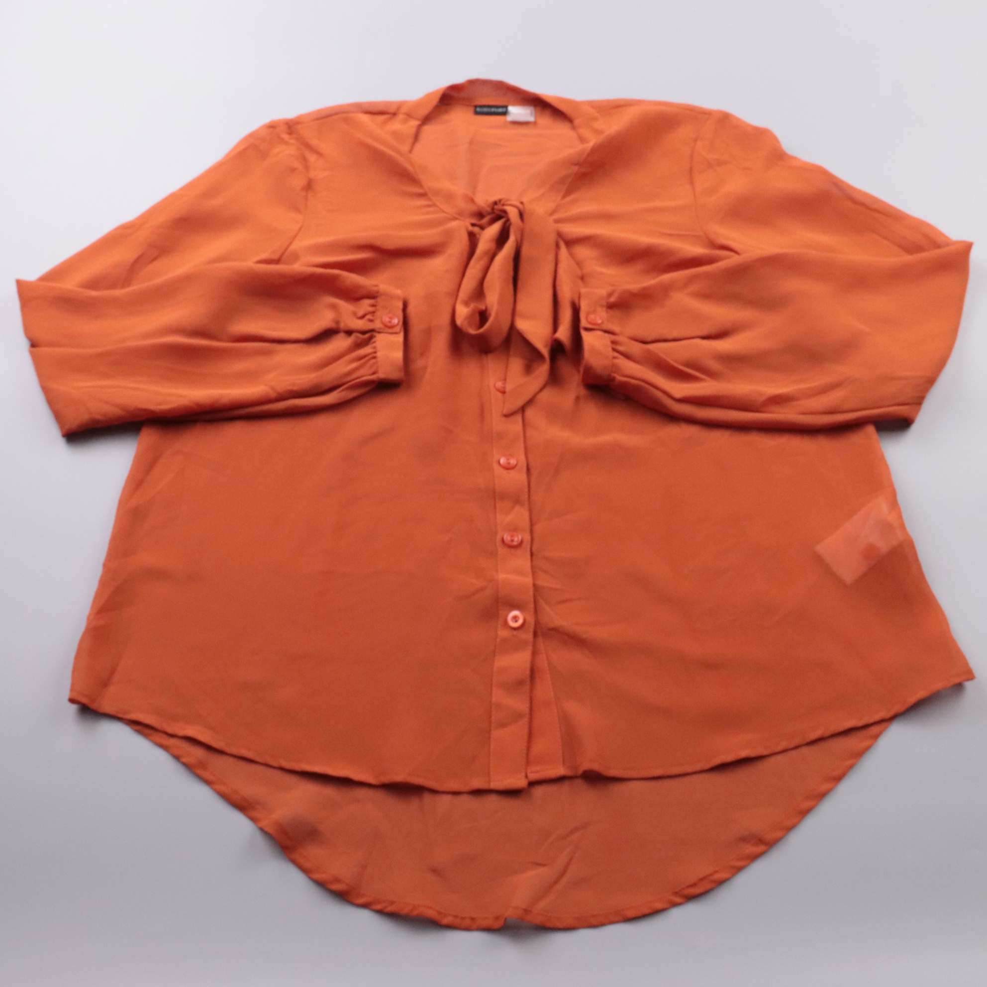 Блузка Bodyflirt терракотового цвета из лёгкой ткани, с V-вырезом и завязками-бантом у горловины. Подойдёт для офиса и на выход, хорошо смотрится с брюками или юбкой. Практичный плюс — полиэстер почти не мнётся и быстро сохнет.