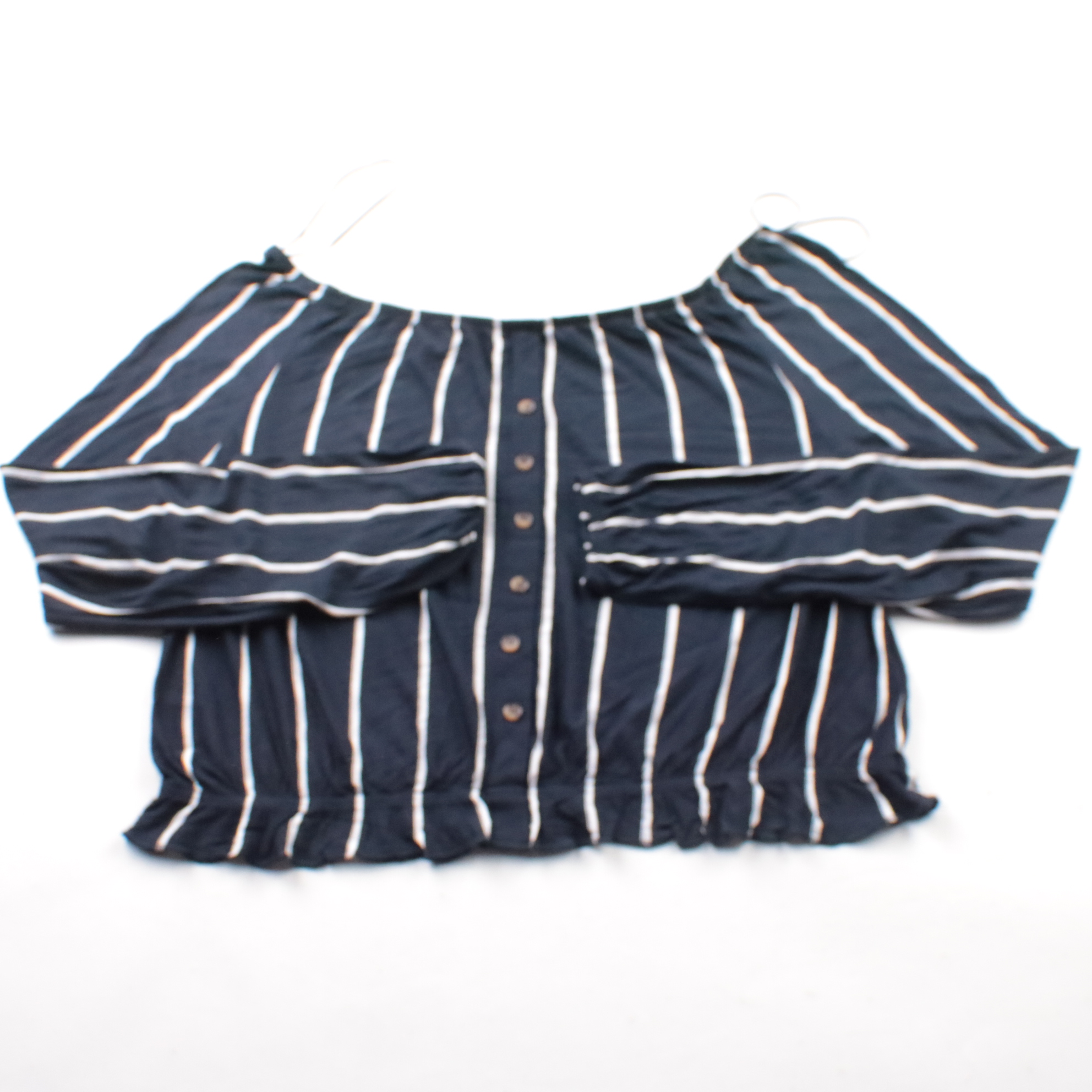 Женская блузка в тёмно-синем цвете с белыми полосками, с открытыми плечами и застёжкой на пуговицы спереди. Подойдёт для летних прогулок и отдыха, хорошо смотрится с джинсами или шортами. Эластичная линия низа помогает посадке и не сползает при движении.