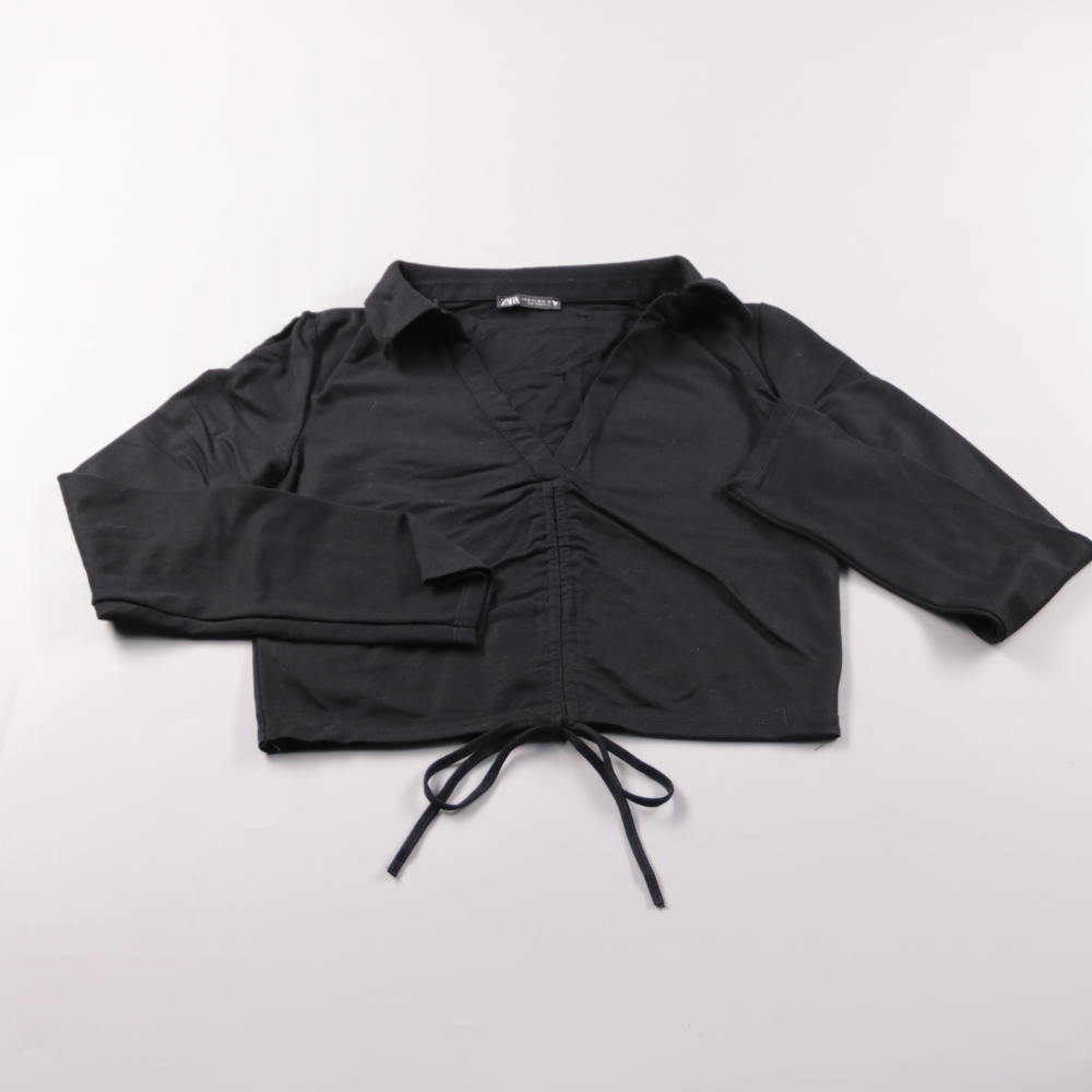 Чёрная блузка Zara с V-образным вырезом и завязками спереди, слегка укороченная. Подойдёт для повседневных образов и вечерних выходов с высокой посадкой брюк или юбкой. Материал мягкий и эластичный, удобно садится по фигуре и не стесняет движений.