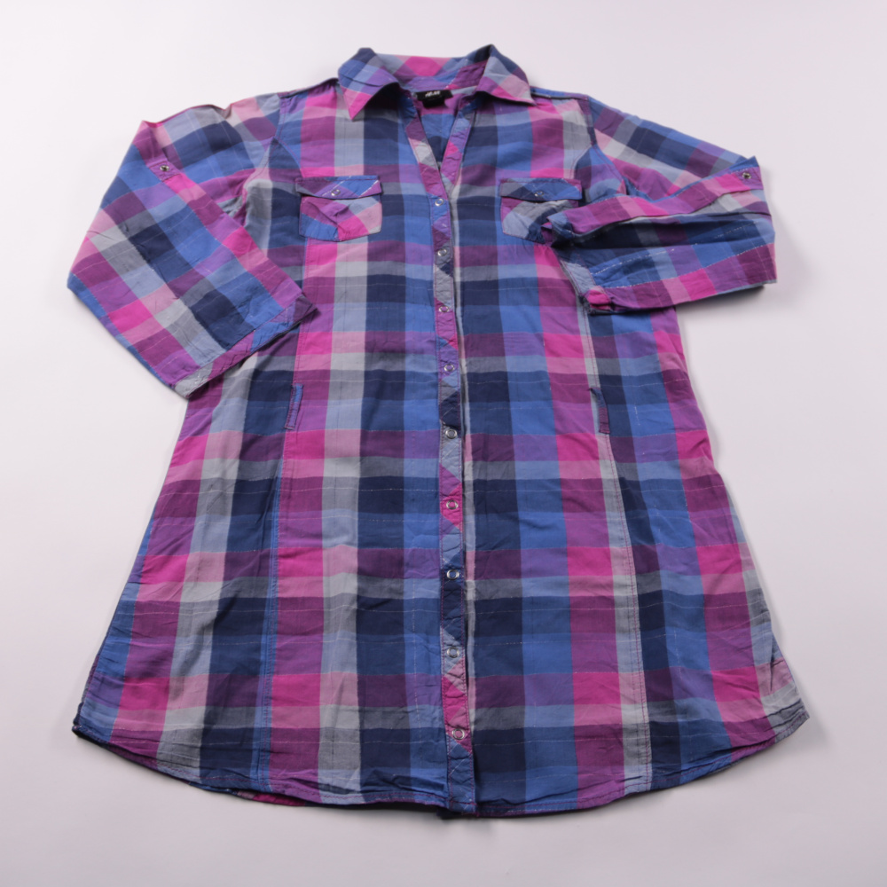 Женская рубашка H&M в крупную клетку в сине-фиолетово-розовой гамме, застёгивается на пуговицы и с накладными карманами на груди. Подойдёт для повседневных образов с джинсами или как лёгкий второй слой в прохладную погоду. Практичный хлопковый материал...