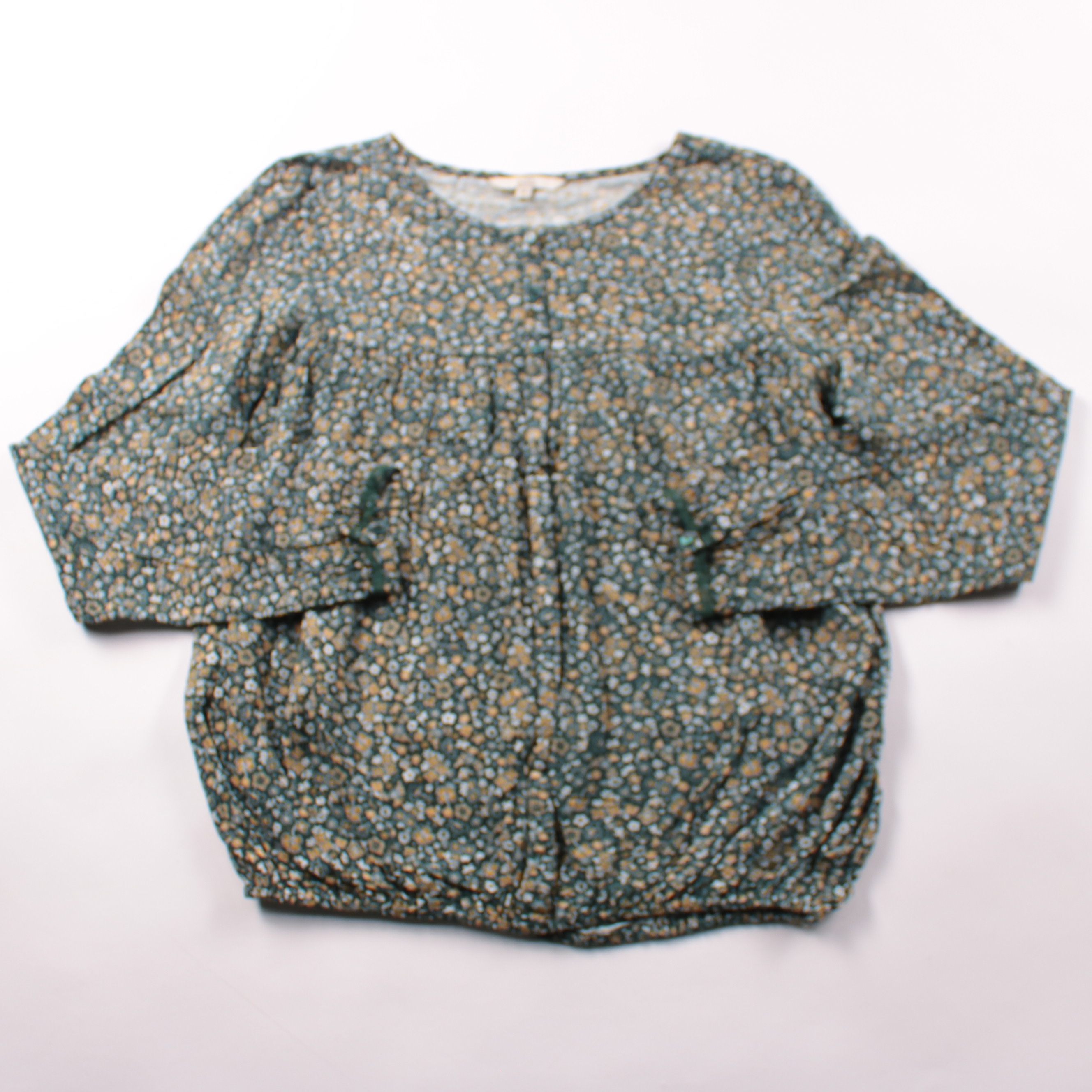 Женская блузка Clockhouse с мелким цветочным принтом в зелёно-бежевой гамме и круглым вырезом. Подойдёт для повседневных образов и офиса с базовыми брюками или джинсами. Лёгкая ткань и свободный крой комфортны в течение дня.