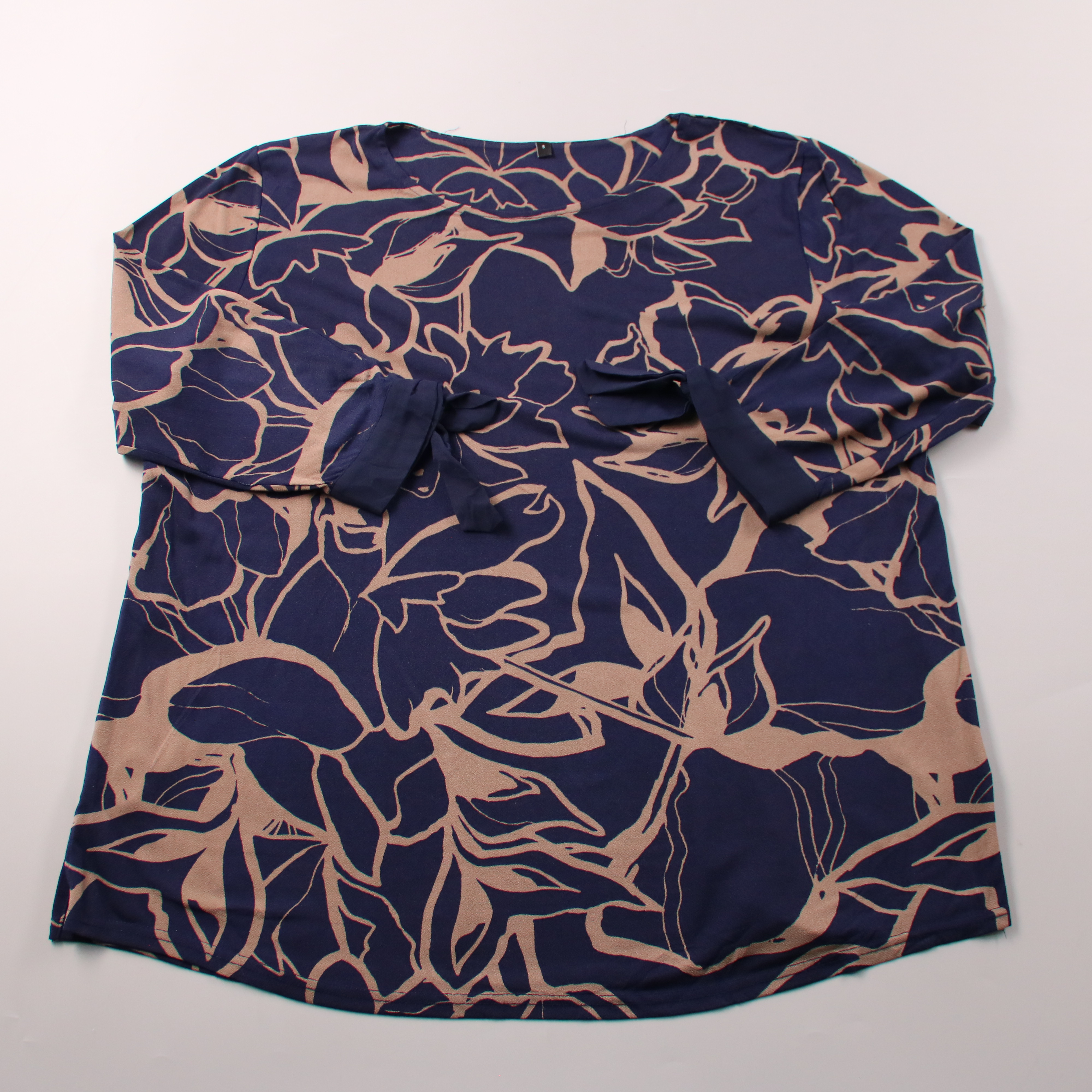 Женская блузка с крупным цветочным принтом в тёмно-синем и бежевом цветах. Прямой крой и длинный рукав с завязками на манжетах подойдёт для офиса и на каждый день. Легко сочетать с однотонными брюками или юбкой, ткань выглядит аккуратно и почти не мнётся.