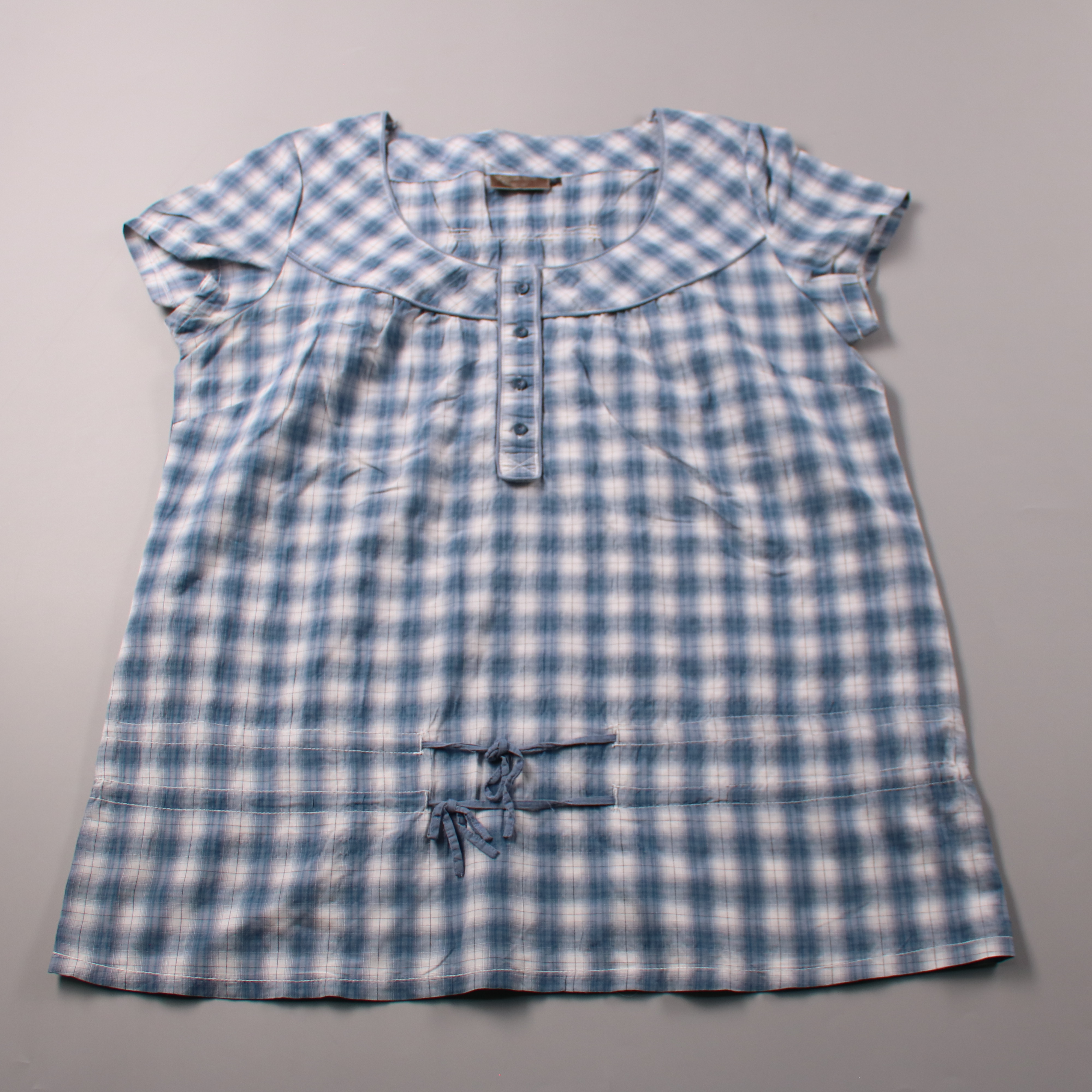 Женская блузка Woman в голубую клетку, с коротким рукавом и планкой на пуговицах. Подойдёт для повседневных летних образов и офиса в стиле casual. Лёгкая ткань и свободный крой не сковывают движения и комфортны в носке.