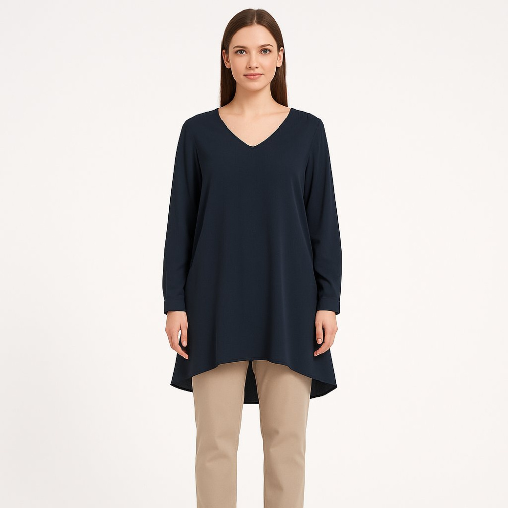 Тёмно-синяя женская блузка свободного кроя с V-образным вырезом и удлинённой спинкой. Подойдёт для офиса и повседневных образов, хорошо смотрится с брюками и джинсами. Практична тем, что не сковывает движения и легко сочетается с базовым гардеробом.