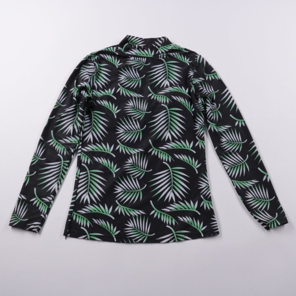 Женская блузка с длинным рукавом и тропическим принтом на чёрном фоне. Подойдёт для повседневных образов и офиса с нестрогим дресс-кодом, хорошо смотрится с однотонными брюками или джинсами. Практичный плюс — лёгкая синтетическая ткань быстро сохнет и ...