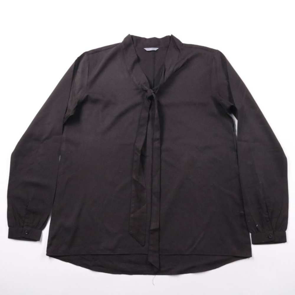 Женская чёрная блузка с завязками у горловины, размер 40 по бирке. Подойдёт для офиса и на выход, хорошо смотрится с брюками и юбкой. Практичный материал 100% полиэстер — легко стирается и быстро сохнет.